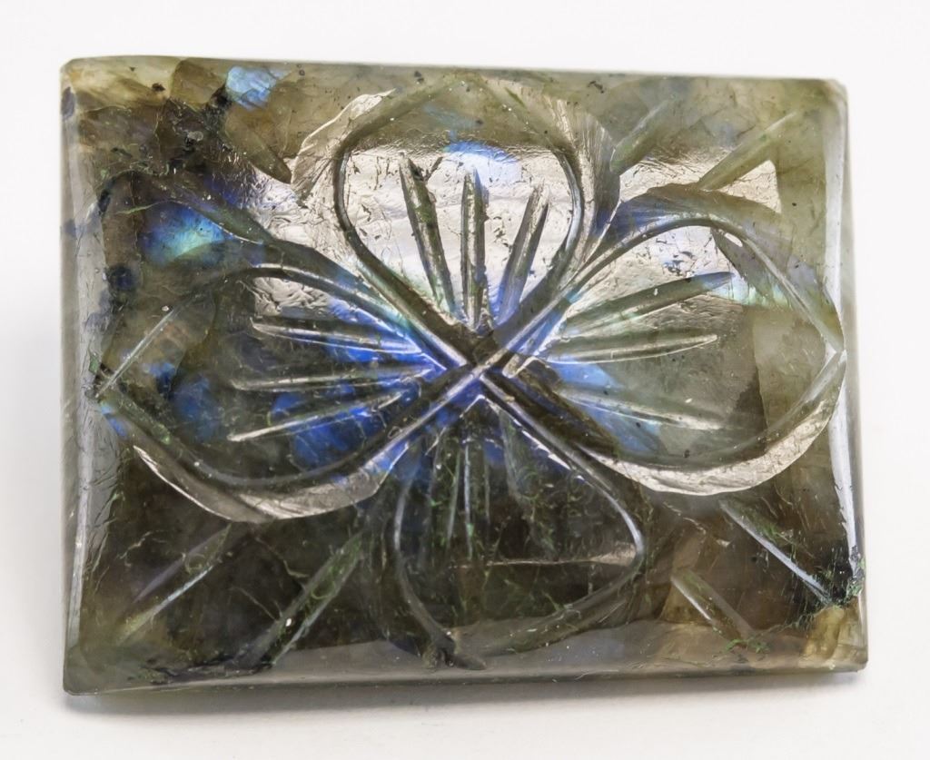 35.10 ct square cabochon cut multi-color labradorite. Accompanied with GLI certificate. 27.20 x 21.90 x 5.70 mm.