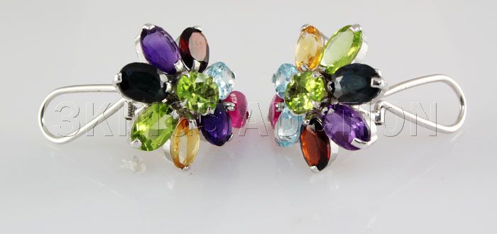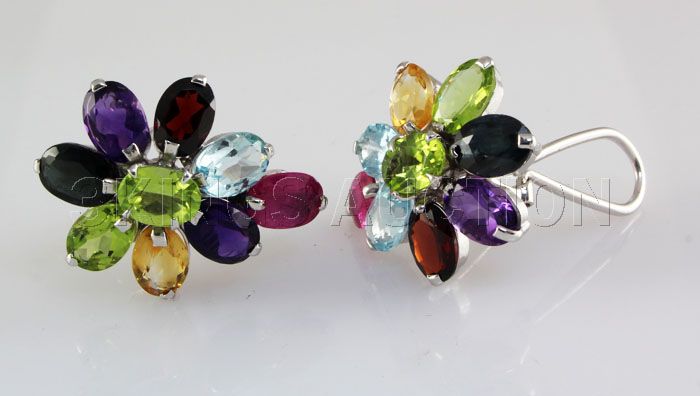 35.12CTW Multi-color Precious Stone Silver Earring **|**|** 7x5mm Flower Cluster of Multi-color Precious Stone Silver Earring; ctw: 17.97; stone count: 18; gram weight: 3.43 ; MSRP: $1500