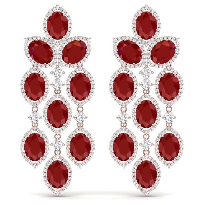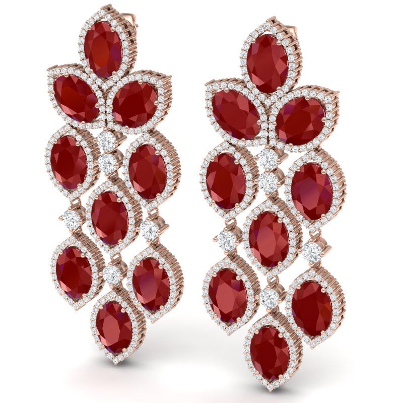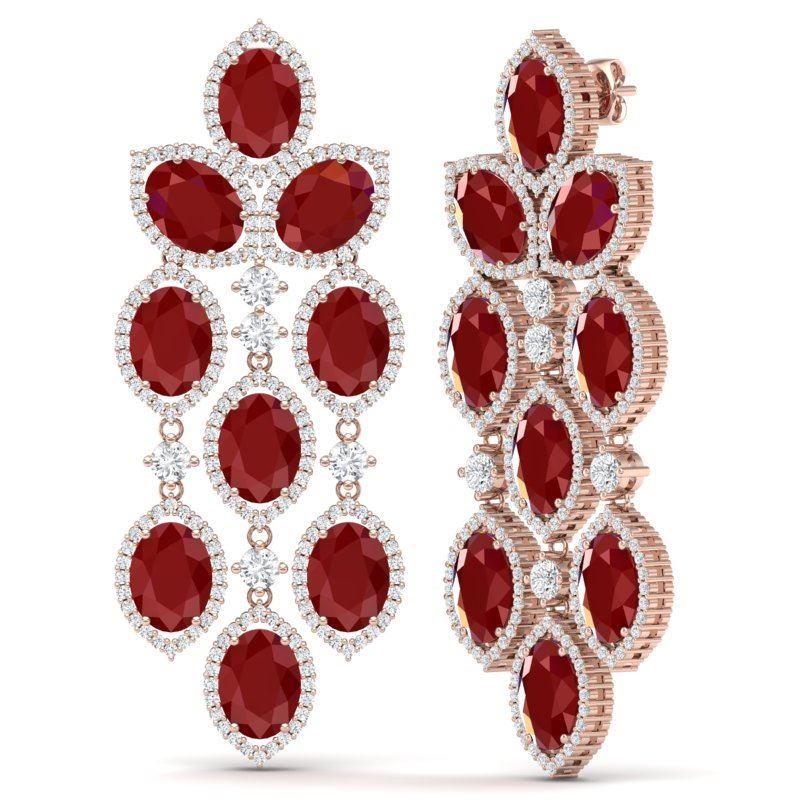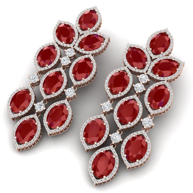 35.15 CTW Royalty Designer Ruby & VS Diamond Earrings 18K Rose Gold ---- Luxury Designer Brand Earring Appraised Retail Price at $52,000 ---- SKU Number US38926 18K Rose gold Earring Size is 55 Millimeter long, Earring measuring approx. 2 x 3/4 Inches, weighing in total approx. 18 grams. Made in the USA and is stamped 18K, Main stone 31.5 carat total weight containing 36 pieces of Intense Mid-Opaque Red color with AAA quality Oval shape cut Ruby , Stone #2 3.65 carat total weight containing 406 pieces of G-H color with VS/SI quality Round shape cut