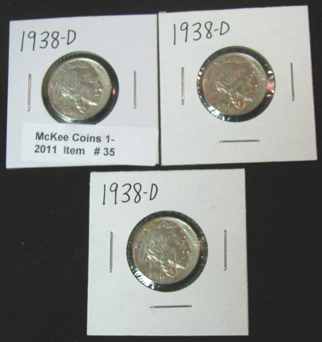 35. (3) 1938 D Buffalo Nickels. VG-VF.