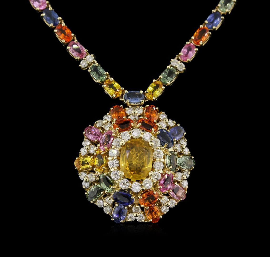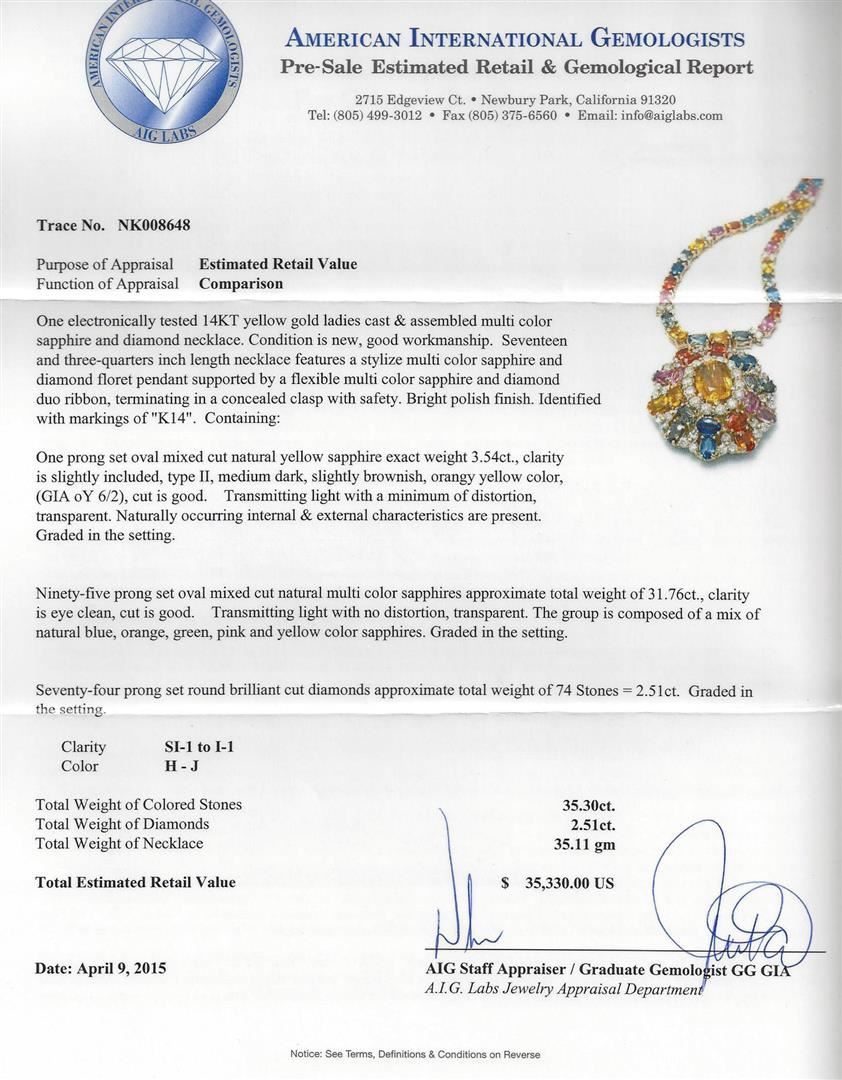 One electronically tested yellow gold ladies cast & assembled multi color sapphire and diamond necklace. Condition is new, good workmanship. Seventeen and three-quarters inch length necklace features a stylize multicolor sapphire and diamond floret pendant supported by a flexible multi color sapphire and diamond duo ribbon, terminating in a concealed clasp with safety. Bright polish finish. Identified with markings of "K14". Containing: One prong set oval mixed cut natural yellow sapphire exact weight 3.54ct., clarity is slightly included, type II, medium dark, slightly brownish, orangy yellow color, (GIA oY 6/2), cut is good. Transmitting light with a minimum of distortion, transparent. Naturally occurring internal & external characteristics are present. Graded in the setting. Ninety-five prong set oval mixed cut natural multi color sapphires approximate total weight of 31.76ct., clarity is eye clean, cut is good. Transmitting light with no distortion, transparent. The group is composed of a mix of natural blue, orange, green, pink and yellow color sapphires. Graded in the setting. Seventy-four prong set round brilliant cut diamonds approximate total weight of 74 Stones = 2.5let. Graded in the setting. Clarity: SI-1 to 1-1. Color: H - J. Total Weight of Colored Stones: 35.30ct. Total Weight of Diamonds: 2.51ct.Total Weight of Necklace: 35.11gm. AIG Appraised at $35,330.00.
