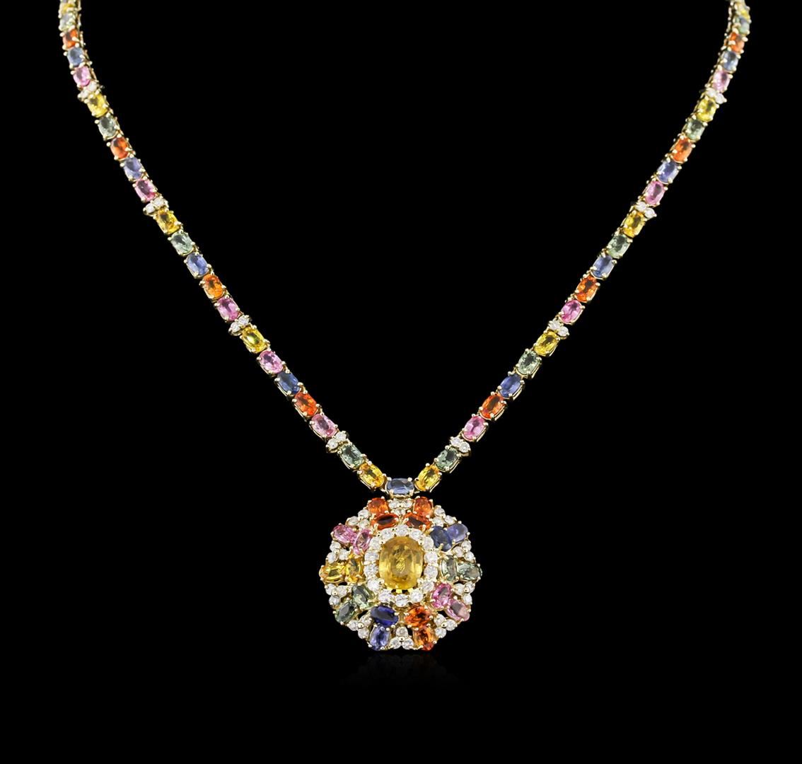 One electronically tested yellow gold ladies cast & assembled multi color sapphire and diamond necklace. Condition is new, good workmanship. Seventeen and three-quarters inch length necklace features a stylize multicolor sapphire and diamond floret pendant supported by a flexible multi color sapphire and diamond duo ribbon, terminating in a concealed clasp with safety. Bright polish finish. Identified with markings of "K14". Containing: One prong set oval mixed cut natural yellow sapphire exact weight 3.54ct., clarity is slightly included, type II, medium dark, slightly brownish, orangy yellow color, (GIA oY 6/2), cut is good. Transmitting light with a minimum of distortion, transparent. Naturally occurring internal & external characteristics are present. Graded in the setting. Ninety-five prong set oval mixed cut natural multi color sapphires approximate total weight of 31.76ct., clarity is eye clean, cut is good. Transmitting light with no distortion, transparent. The group is composed of a mix of natural blue, orange, green, pink and yellow color sapphires. Graded in the setting. Seventy-four prong set round brilliant cut diamonds approximate total weight of 74 Stones = 2.5let. Graded in the setting. Clarity: SI-1 to 1-1. Color: H - J. Total Weight of Colored Stones: 35.30ct. Total Weight of Diamonds: 2.51ct.Total Weight of Necklace: 35.11gm. AIG Appraised at $35,330.00.