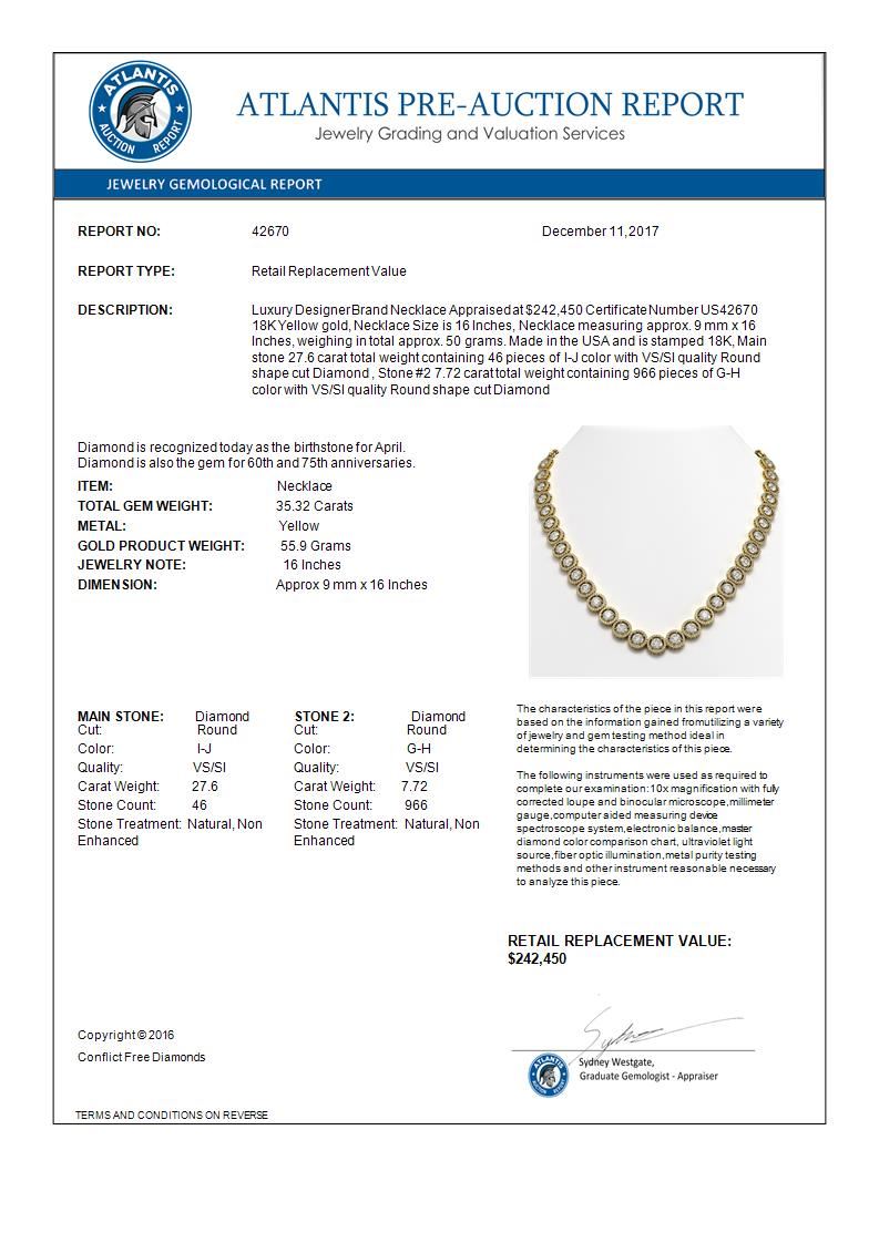 REF-5509N8Y -42670 ---- 35.32 CTW Diamond Designer Necklace 18K Yellow Gold ---- Luxury Designer Brand Necklace Appraised at $242,450 Certificate Number US42670 18K Yellow gold, Necklace Size is 16 Inches, Necklace measuring approx. 9 mm x 16 Inches, weighing in total approx. 50 grams. Made in the USA and is stamped 18K, Main stone 27.6 carat total weight containing 46 pieces of I-J color with VS/SI quality Round shape cut Diamond , Stone #2 7.72 carat total weight containing 966 pieces of G-H color with VS/SI quality Round shape cut Diamond