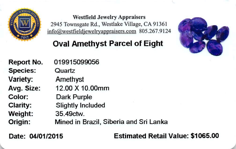 Eight oval mixed cut natural amethysts exact total weight 35.49ct., clarity is slightly included, type II, dark, very slightly grayish, purple color, (GIA P 7/3), cut is good. Westfield Appraised at $1,065.00.
