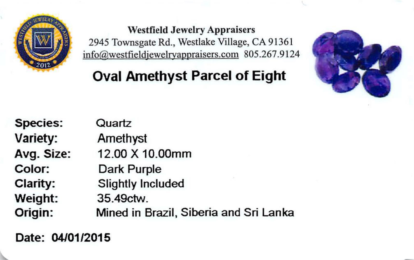 Eight oval mixed cut natural amethysts exact total weight 35.49ct., clarity is slightly included, type II, dark, very slightly grayish, purple color, (GIA P 7/3), cut is good. UGS Appraised.