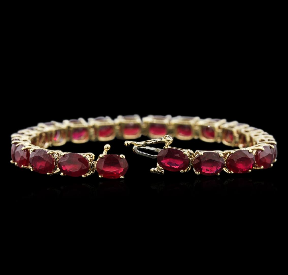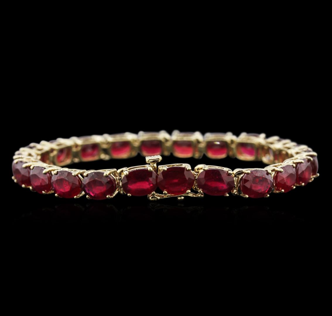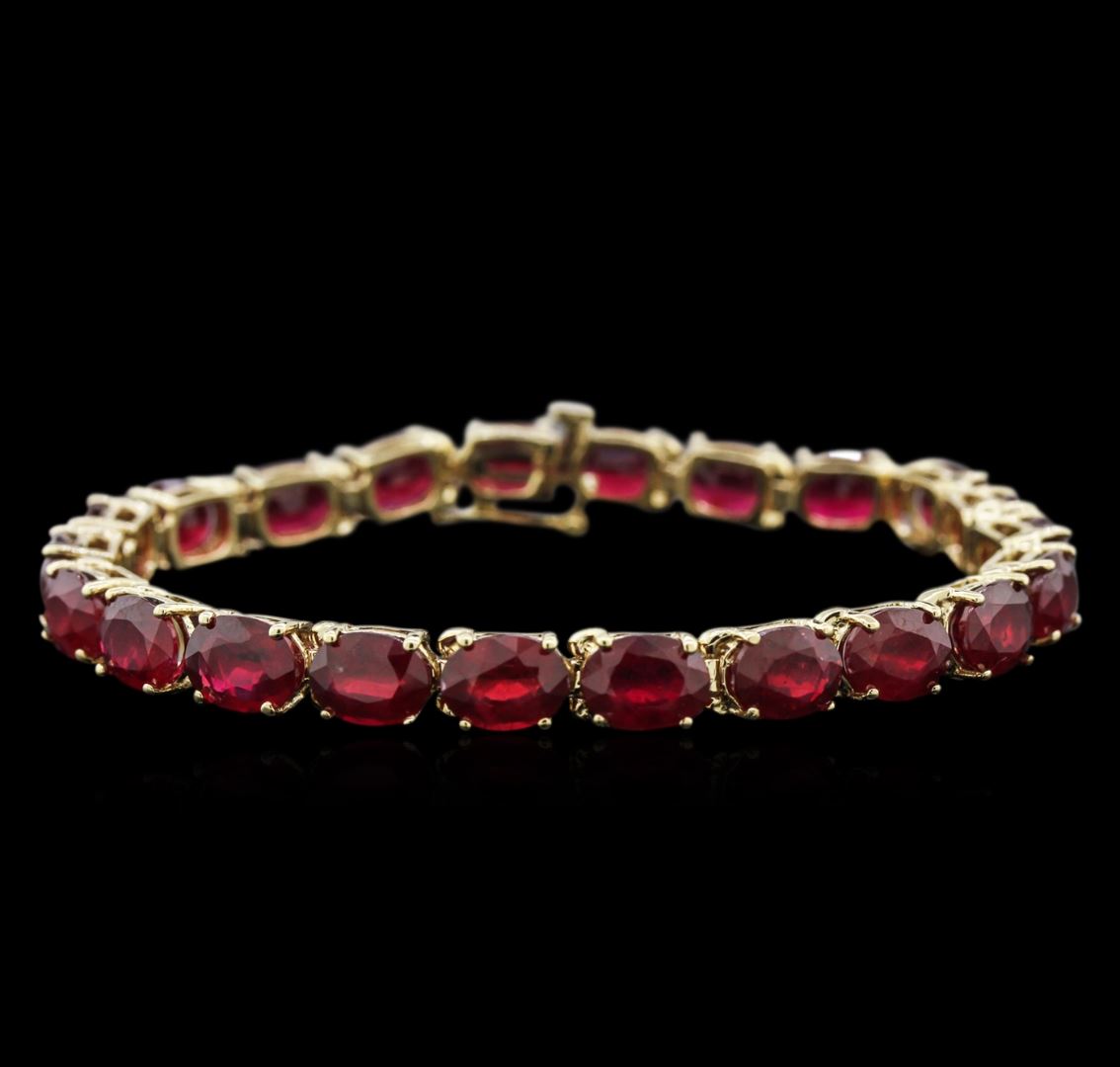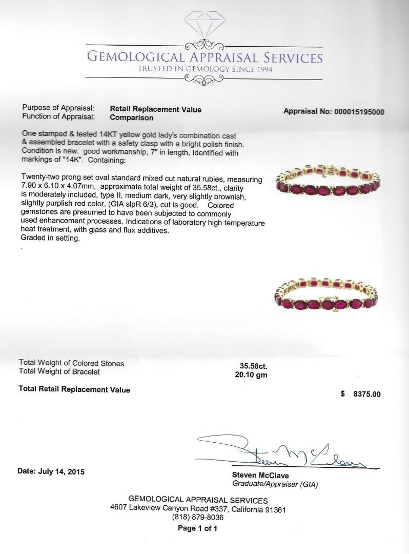 One stamped & tested 14KT yellow gold lady's combination cast & assembled bracelet with a safety clasp with a bright polish finish. Condition is new. Good workmanship, 7" in length, Identified with markings of "14K". Containing: Twenty-two prong set oval standard mixed cut natural rubies, measuring 7.90 x 6.10 x 4.07mm, approximate total weight of 35.58ct., clarity is moderately included, type II, medium dark, very slightly brownish, slightly purplish red color, (GIA slpR 6/3), cut is good. Colored gemstones are presumed to have been subjected to commonly used enhancement processes. Indications of laboratory high temperature heat treatment, with glass and flux additives. Graded in setting. Total Weight of Colored Stones: 35.58ct. Total Weight of Bracelet: 20.10 gm. GAS Appraised at $8,375.00.