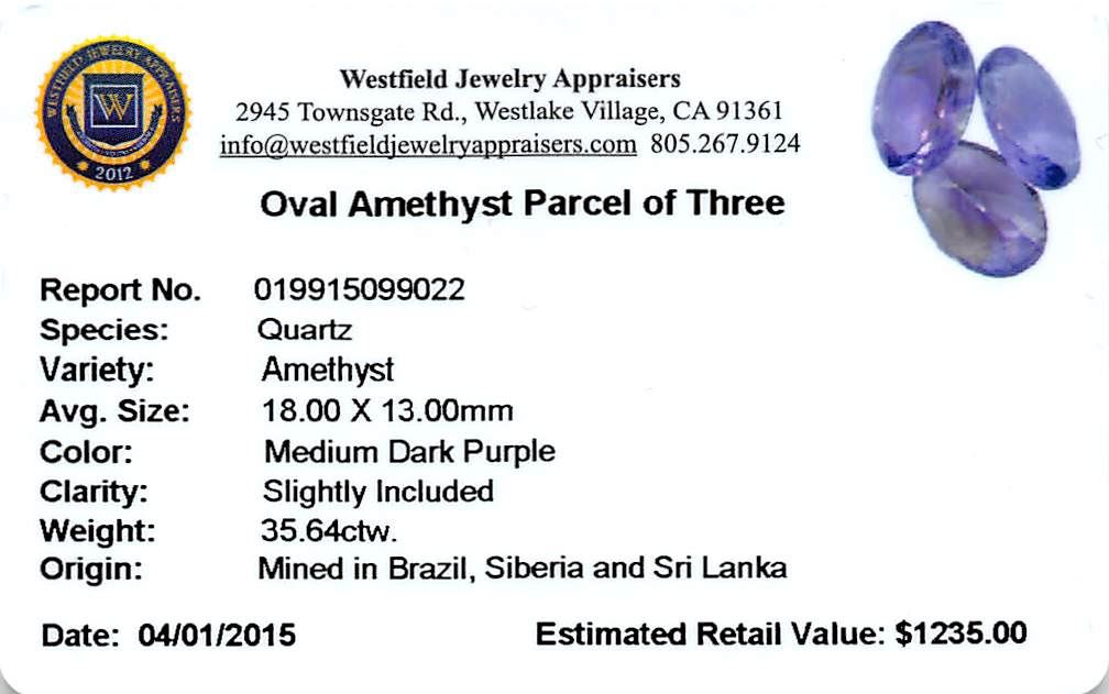 Three oval mixed cut natural amethysts exact total weight 35.64ct., clarity is slightly included, type II, medium dark, very slightly grayish, purple color, (GIA P 6/3), cut is good. Westfield Appraised at $1,235.00.