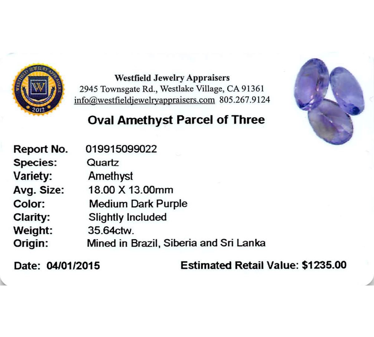Three oval mixed cut natural amethysts exact total weight 35.64ct., clarity is slightly included, type II, medium dark, very slightly grayish, purple color, (GIA P 6/3), cut is good. Westfield Appraised at $1,235.00.
