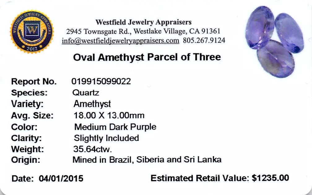 Three oval mixed cut natural amethysts exact total weight 35.64ct., clarity is slightly included, type II, medium dark, very slightly grayish, purple color, (GIA P 6/3), cut is good. Westfield Appraised at $1,235.00.
