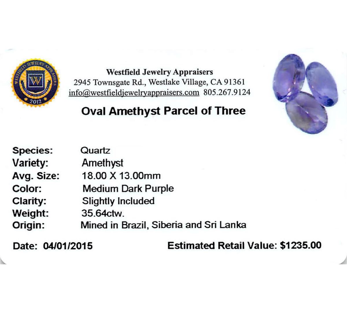 Three oval mixed cut natural amethysts exact total weight 35.64ct., clarity is slightly included, type II, medium dark, very slightly grayish, purple color, (GIA P 6/3), cut is good. Westfield Appraised at $1,235.00.