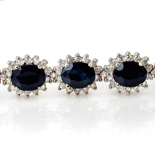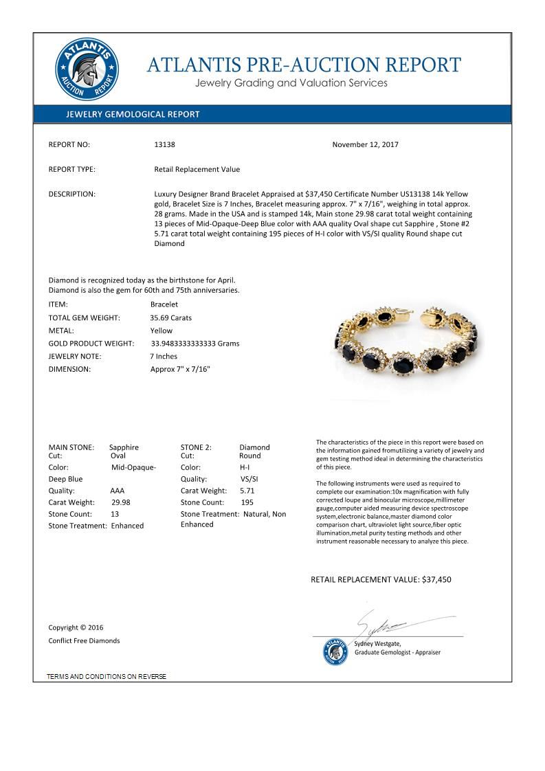 REF-486W4F -13138 ---- 35.69 CTW Blue Sapphire & Diamond Bracelet 14K Yellow Gold ---- Luxury Designer Brand Bracelet Appraised at $37,450 Certificate Number US13138 14k Yellow gold, Bracelet Size is 7 Inches, Bracelet measuring approx. 7" x 7/16", weighing in total approx. 28 grams. Made in the USA and is stamped 14k, Main stone 29.98 carat total weight containing 13 pieces of Mid-Opaque-Deep Blue color with AAA quality Oval shape cut Sapphire , Stone #2 5.71 carat total weight containing 195 pieces of H-I color with VS/SI quality Round shape cut Diamond