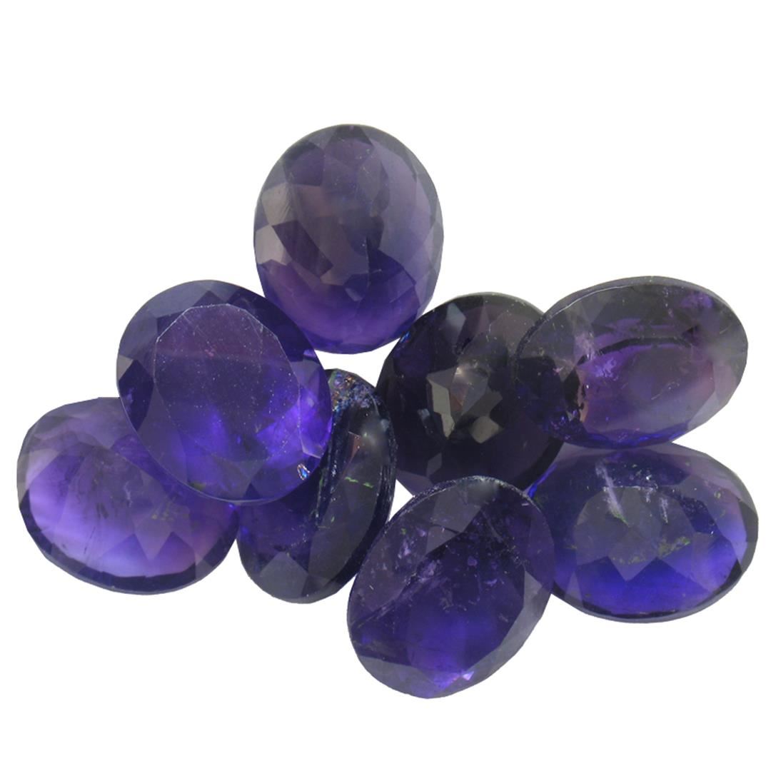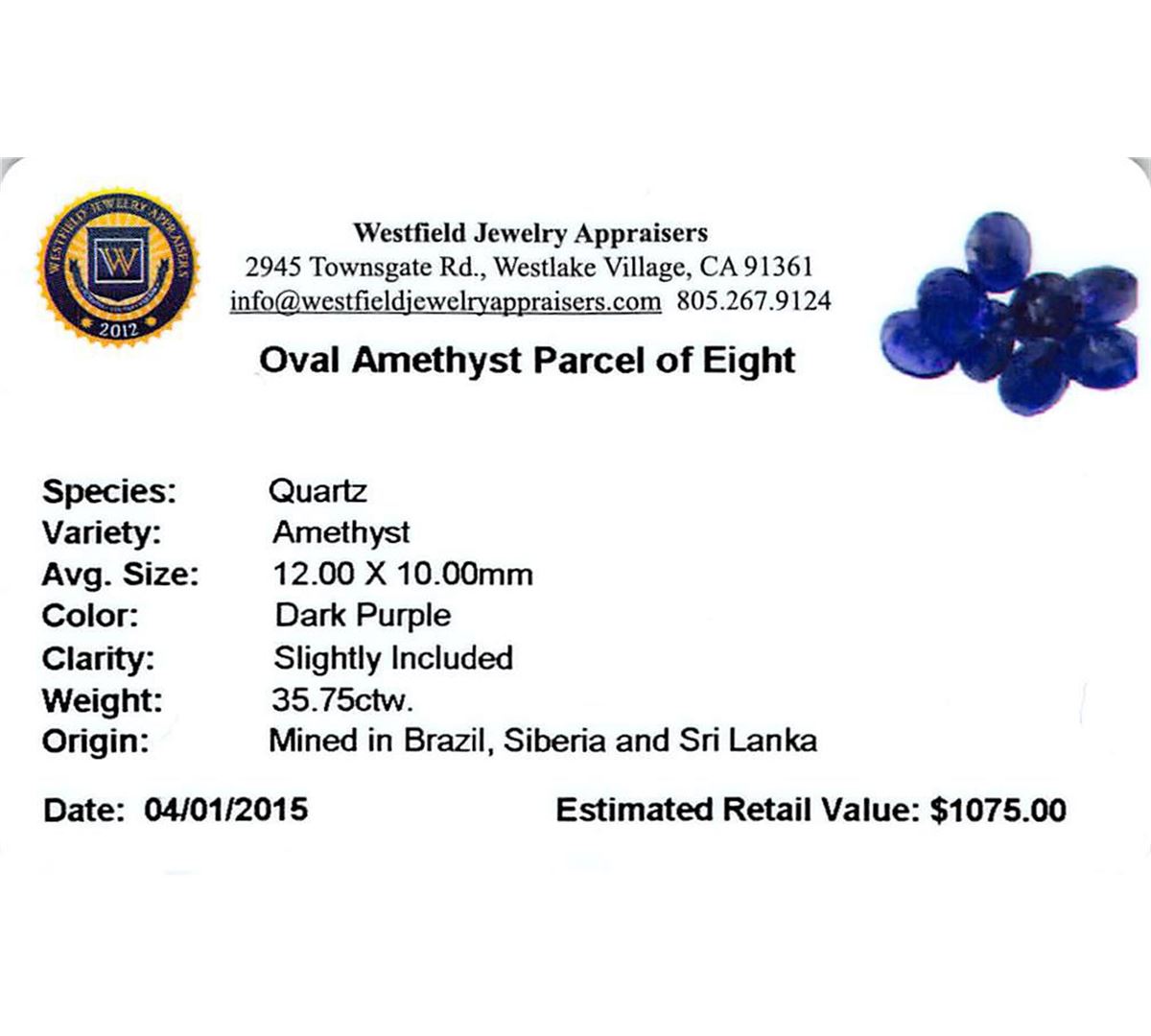 Eight oval mixed cut natural amethysts exact total weight 35.75ct., clarity is slightly included, type II, dark, very slightly grayish, purple color, (GIA P 7/3), cut is good. Westfield Appraised at $1,075.00.