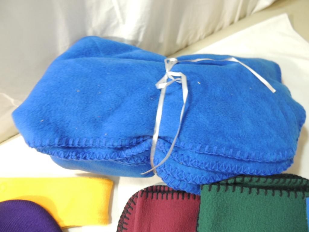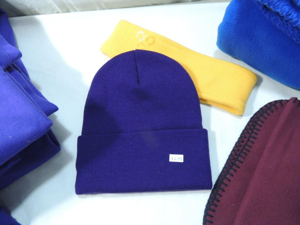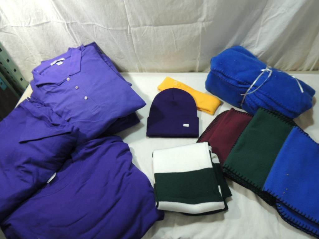 ASSORTED SCARVES AND HEAD WRAP PLAIN BLANKET AND PURPLE POLO SHIRTS ASSORTED SIZES. LONG SLEEVE AND SHORT SLEEVE TSHIRTS.