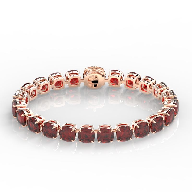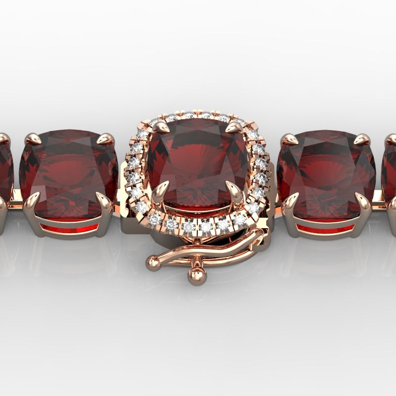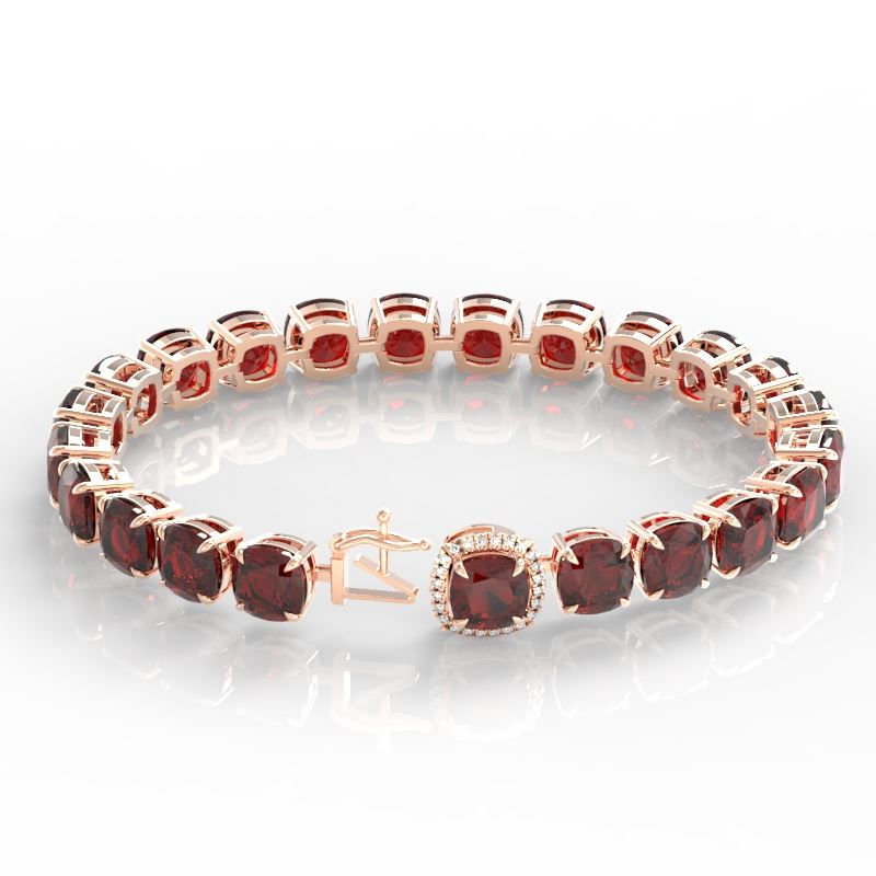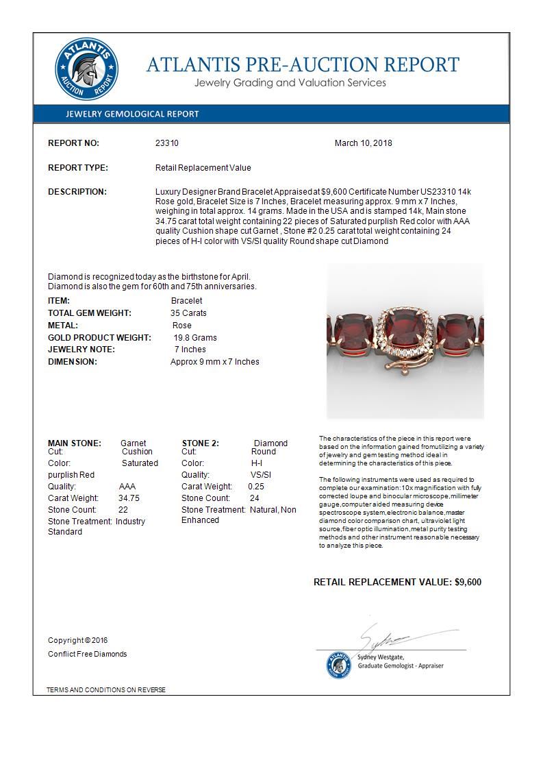 REF-134F2N -23310 ---- 35 CTW Garnet & Micro Pave VS/SI Diamond Halo Designer Bracelet 14K Rose Gold ---- Luxury Designer Brand Bracelet Appraised at $9,600 Certificate Number US23310 14k Rose gold, Bracelet Size is 7 Inches, Bracelet measuring approx. 9 mm x 7 Inches, weighing in total approx. 14 grams. Made in the USA and is stamped 14k, Main stone 34.75 carat total weight containing 22 pieces of Saturated purplish Red color with AAA quality Cushion shape cut Garnet , Stone #2 0.25 carat total weight containing 24 pieces of H-I color with VS/SI quality Round shape cut Diamond