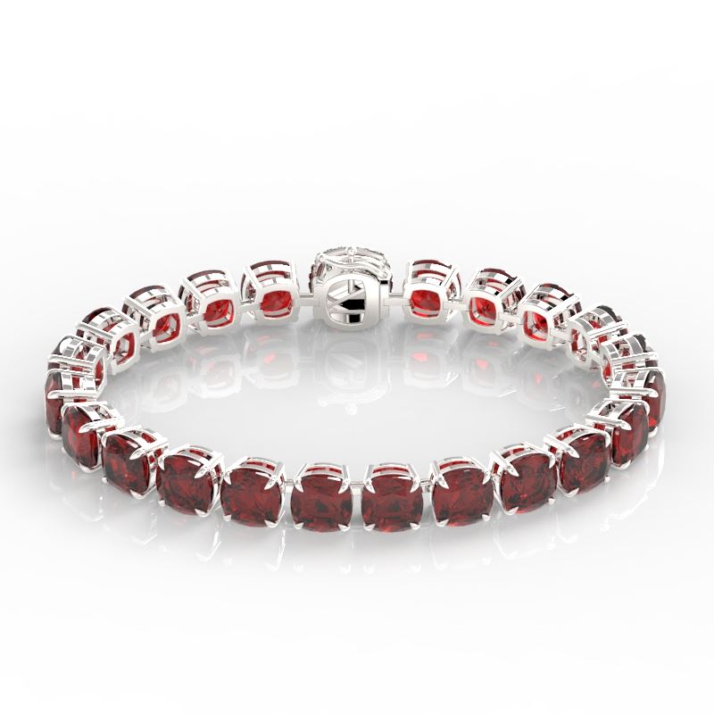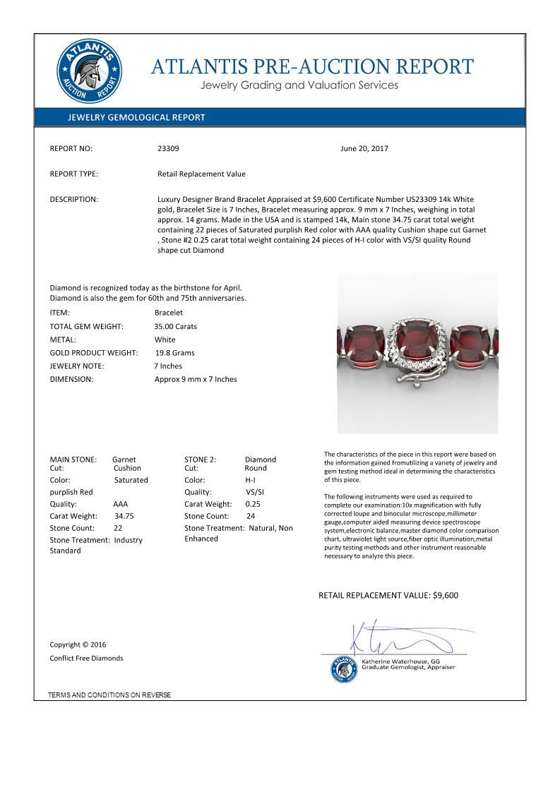 35 CTW Garnet & Micro VS/SI Diamond Halo Designer Bracelet 14K White Gold ---- Luxury Designer Brand Bracelet Appraised Retail Price at $9,600 ---- SKU Number US23309 14k White gold Bracelet Size is 7 Inches, Bracelet measuring approx. 9 mm x 7 Inches, weighing in total approx. 14 grams. Made in the USA and is stamped 14k, Main stone 34.75 carat total weight containing 22 pieces of Saturated purplish Red color with AAA quality Cushion shape cut Garnet , Stone #2 0.25 carat total weight containing 24 pieces of H-I color with VS/SI quality Round shape cut