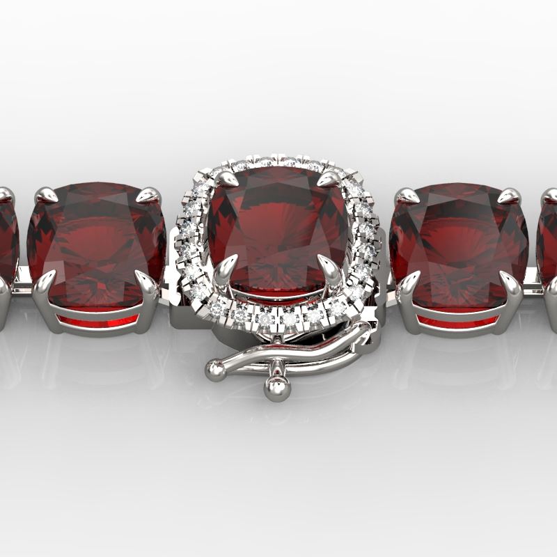 35 CTW Garnet & Micro VS/SI Diamond Halo Designer Bracelet 14K White Gold ---- Luxury Designer Brand Bracelet Appraised Retail Price at $9,600 ---- SKU Number US23309 14k White gold Bracelet Size is 7 Inches, Bracelet measuring approx. 9 mm x 7 Inches, weighing in total approx. 14 grams. Made in the USA and is stamped 14k, Main stone 34.75 carat total weight containing 22 pieces of Saturated purplish Red color with AAA quality Cushion shape cut Garnet , Stone #2 0.25 carat total weight containing 24 pieces of H-I color with VS/SI quality Round shape cut
