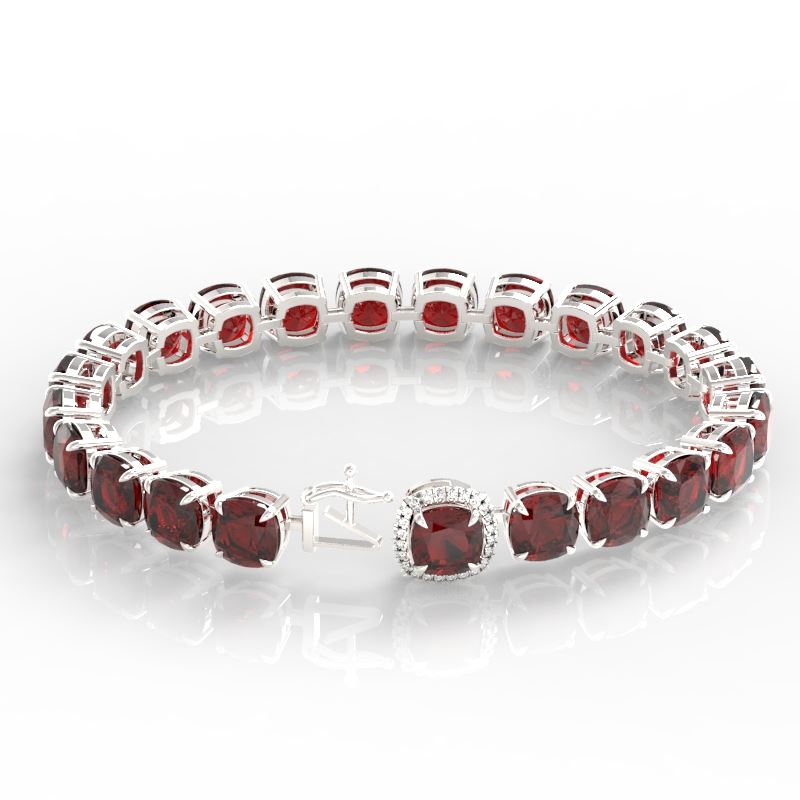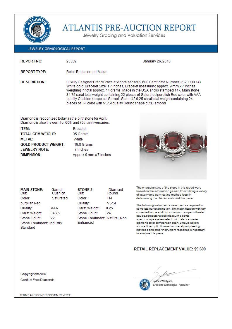 REF-134Y2K -23309 ---- 35 CTW Garnet & Micro VS/SI Diamond Halo Designer Bracelet 14K White Gold ---- Luxury Designer Brand Bracelet Appraised at $9,600 Certificate Number US23309 14k White gold, Bracelet Size is 7 Inches, Bracelet measuring approx. 9 mm x 7 Inches, weighing in total approx. 14 grams. Made in the USA and is stamped 14k, Main stone 34.75 carat total weight containing 22 pieces of Saturated purplish Red color with AAA quality Cushion shape cut Garnet , Stone #2 0.25 carat total weight containing 24 pieces of H-I color with VS/SI quality Round shape cut Diamond