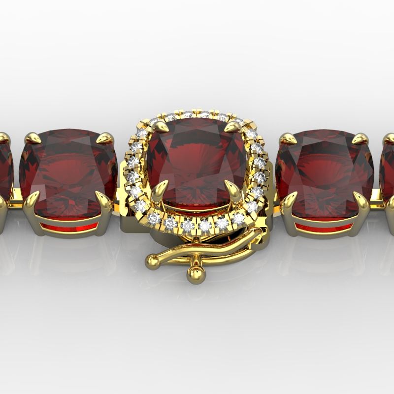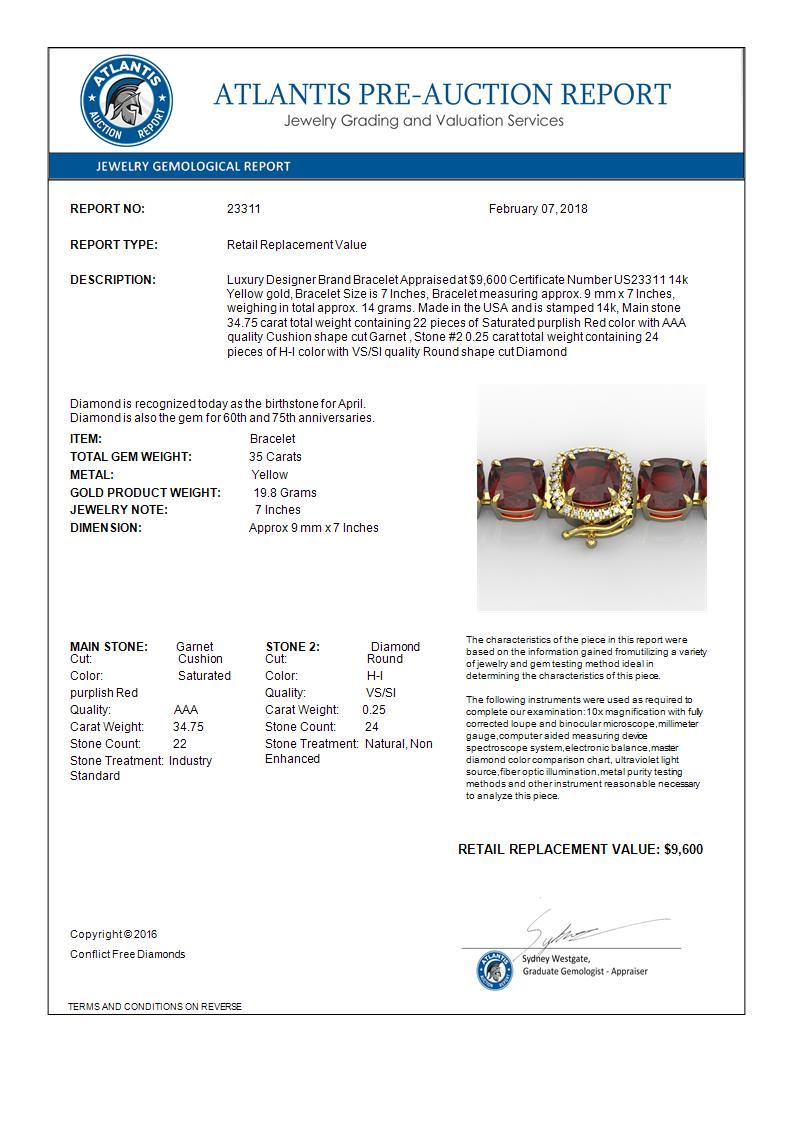 REF-134K2W -23311 ---- 35 CTW Garnet & Micro VS/SI Diamond Halo Designer Bracelet 14K Yellow Gold ---- Luxury Designer Brand Bracelet Appraised at $9,600 Certificate Number US23311 14k Yellow gold, Bracelet Size is 7 Inches, Bracelet measuring approx. 9 mm x 7 Inches, weighing in total approx. 14 grams. Made in the USA and is stamped 14k, Main stone 34.75 carat total weight containing 22 pieces of Saturated purplish Red color with AAA quality Cushion shape cut Garnet , Stone #2 0.25 carat total weight containing 24 pieces of H-I color with VS/SI quality Round shape cut Diamond
