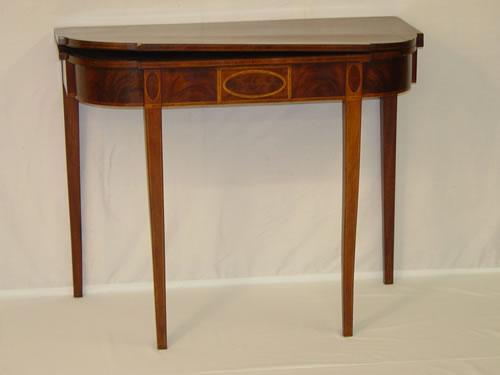 35" HEPPLEWHITE MAHOGANY CARD TABLE W/ SHAPED TOP & BAND, LINE & OVAL INLAY - WEAR & IMPERFECTIONS