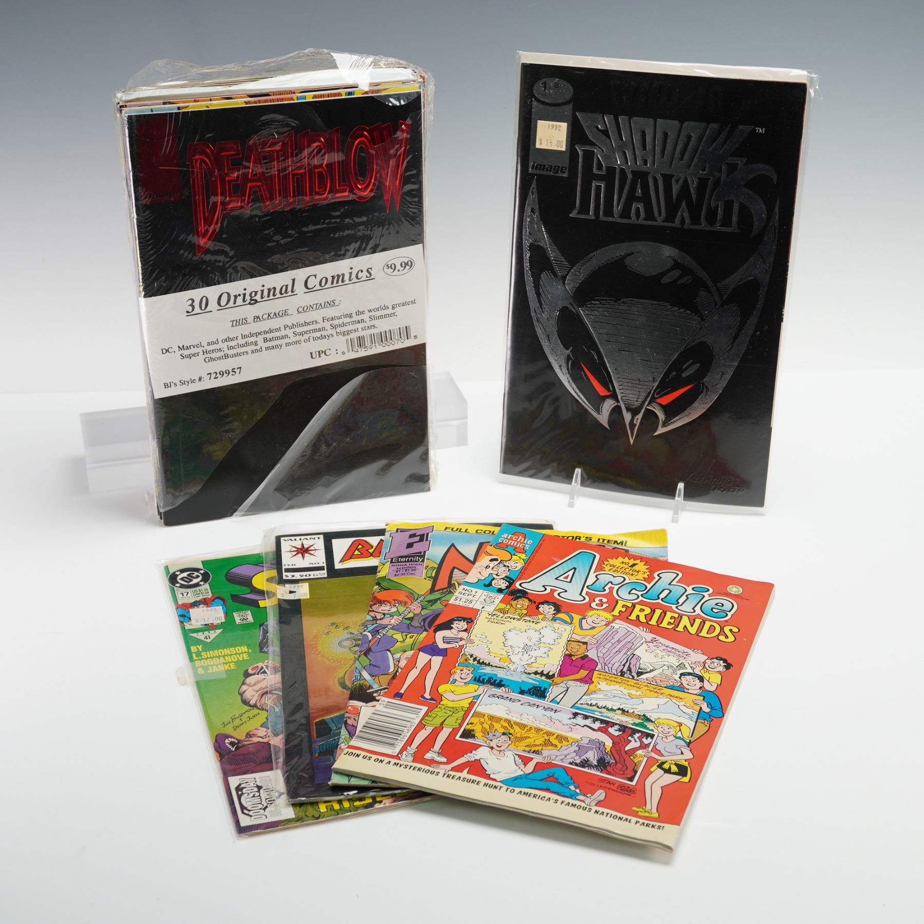 A mixed collection of modern-era comic books. Highlights include titles such as "Deathblow," "ShadowHawk," and "Bloodshot," each notable for their early 1990s graphic style and character design. The assortment also features issues from popular series like "Archie & Friends" and "Harlock: The Fall of the Empire," offering a variety of genres ranging from superhero and science fiction to humor. Together, the lot presents a vibrant cross-section of late 20th-century comic artistry and storytelling from several major and independent publishers. This set of issues is graded at (VG) or Very Good.