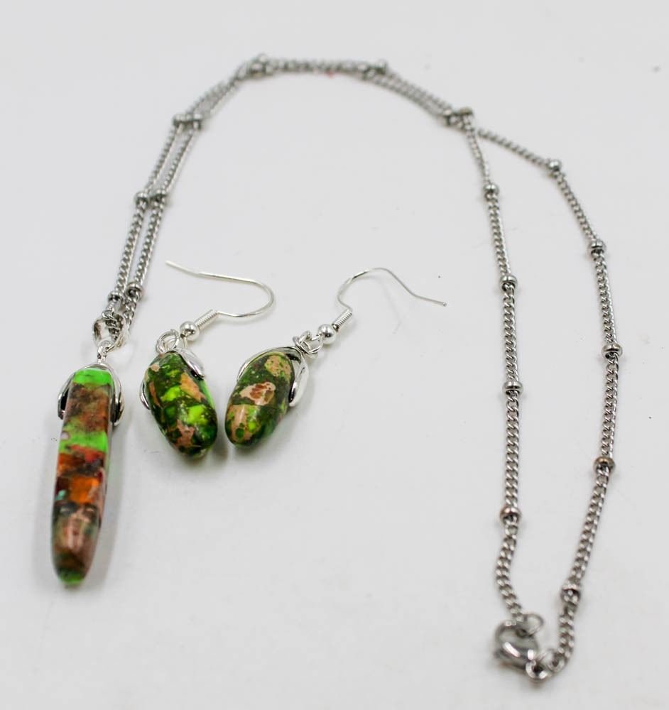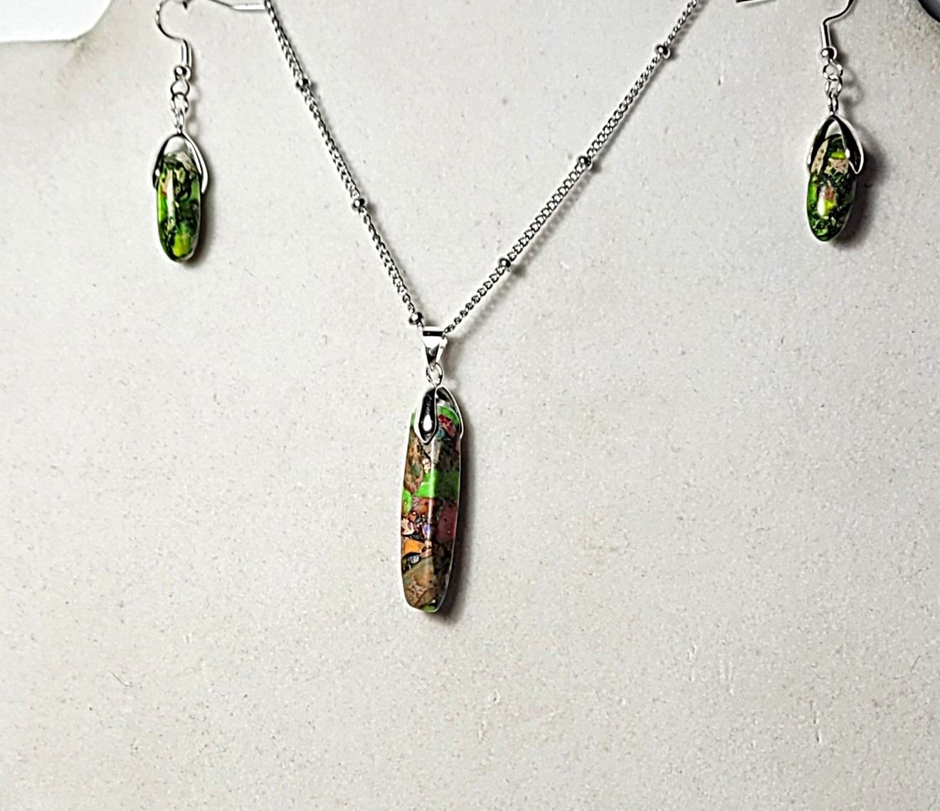 PENDANT ON 18" CHAIN AND MATCHING DROP EARRINGS ON 925 STAMPED FISH HOOK WIRES. JEWELERY