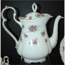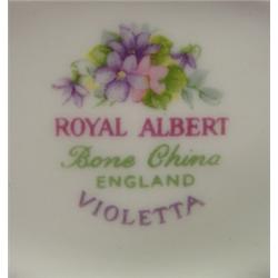 35 PC. ROYAL ALBERT CHINA LUNCHEON SET IN THE VIOLETTA PATTERN. Consists of teapot (9.25" H), 12 plates (8" Dia.), 11 saucers, 8 cups, & sugar & creamer. Marked on bottom.
