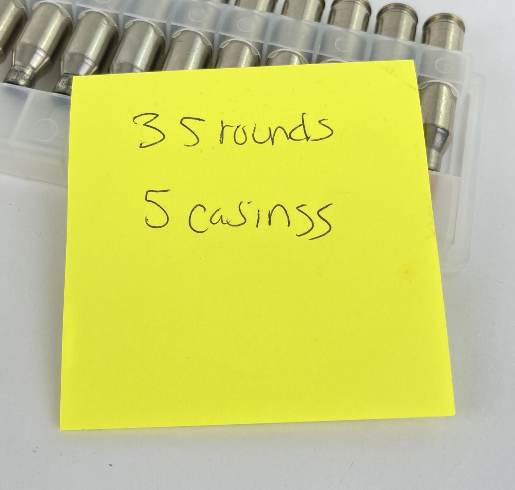 35 rounds, 5 brass. No sales to individuals under the age of 18.