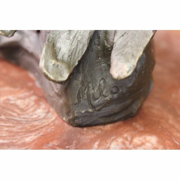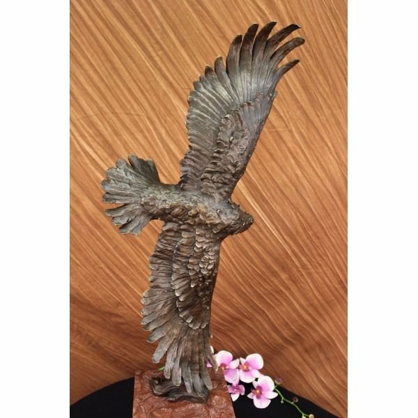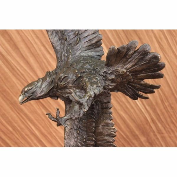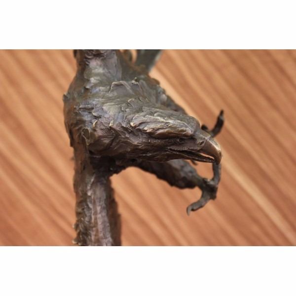 This is a beautifully detailed sculpture of the American bald Eagle. He swoops down from the sky and spreads his wings and claws wide as he speeds down towards the earth. He is flying sideways and is versatile in this method of travel, reaching speeds of 56-70 kilometers per hour (35-43mph) when gliding. His head and tail have brilliant attention to detail as well as his body. He has a dark brown patina and his claws and beak are gorgeous. He is a magnificent recreation of this powerful creature and the National symbol of the U.S.A. He represents resilience, power and strength but mostly it represents Freedom. The right tip of his wing touches waves of water which supports the sculpture he rests upon a solid rose marble base. This sculpture was cast using the "Lost Wax Method" and has a gorgeous brown patina. This sculpture is handmade and is signed by the artist Milo. World famous sculptor "Milo" is the artistic partner of the Lynn Forbes School of Sculpture-and is offering an exclusive signature in the wax of every piece of his items, which are Custom Cast with European Bronze Finery. In effect it makes EACH SCULPTURE an ORIGINAL since each one is different than the next (similar to a Limited Edition). Again, Milo-our partner-IS THE ORIGINAL SCULPTOR of this incredible work of art. Milo was born in Paris in 1939; Milo lived most of his childhood in Andalusia, Spain. Influenced by an artistic family background, he began sculpting at the age of seventeen. After apprenticing with several accomplished sculptors both in America and Spain, he began his own work focusing equally on steel and bronze. Horses and other animals were a natural direction of his work to follow. As a child he was surrounded by horses and witnessing the fighting bulls of Spain gave him an instinct for the inherent drama of these animals. Combining a special cement mixture with steel has allowed him the fluidity of metal with the timelessness of stone. This process enables him to capture the essence of the animal's nature. The characteristic rough texture and movement of line make Milo work easily identifiable in both cement and bronze. Condition:This sculpture is in a very good condition. Bronze Dimensions with Marble Base:Height 35" x Width12"Marble Dimensions:7 1/2"X 7".Height without base: 27" Weight :45 LBSInventory:29150K19492 This is a beautifully detailed sculpture of the American bald Eagle. He swoops down from the sky and spreads his wings and claws wide as he speeds down towards the earth. He is flying sideways and is versatile in this method of travel, reaching speeds of 56-70 kilometers per hour (35-43 mph) when gliding. His head and tail have brilliant atten