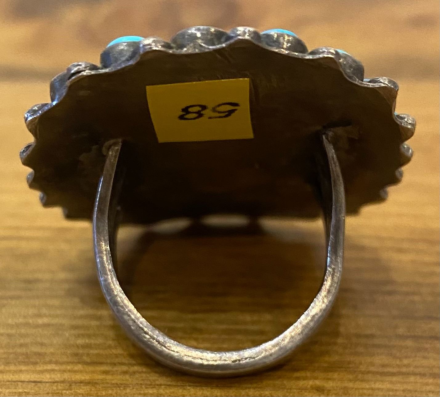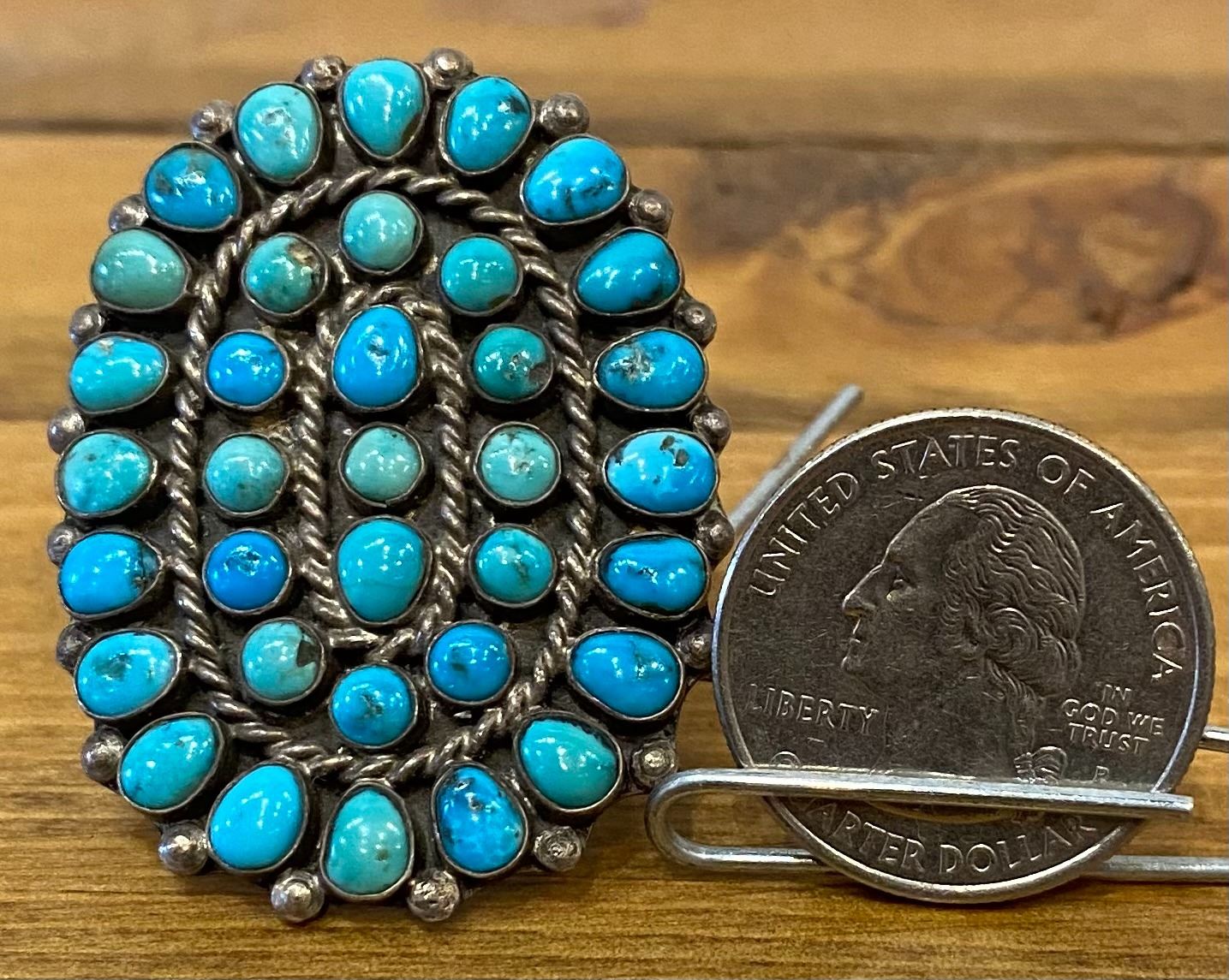 Gorgeous Cluster Ring here! The turquoise is in various colors and the ring is comfortable. Out of a collection but done in Zuni Style. Size 8 16 grams