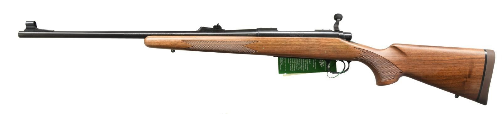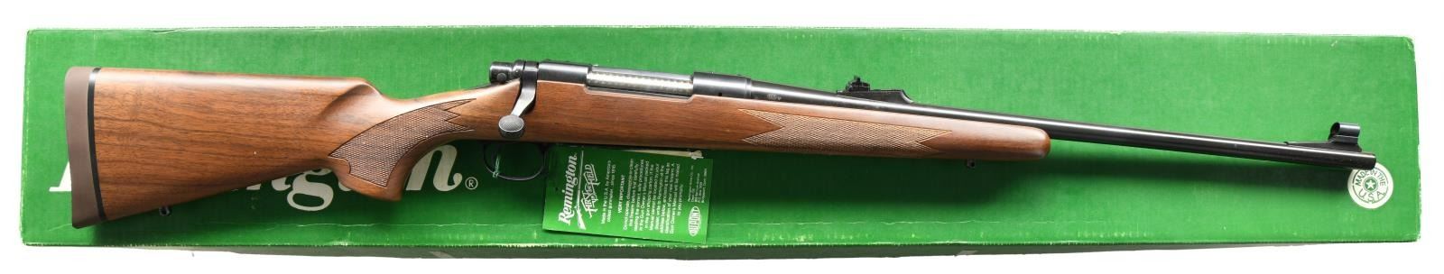 FACTORY BOX. Cal. 35 Whelen. S# C6287539. Bbl. 22". Mfg. August 1988. Bright blued metal finish w/ beautiful hardwood stock. Checkered forend & pistol grip. Rubber factory recoil pad. Sling studs front & rear. Receiver drilled & tapped for scope bases. Hooded blade front sight w/ windage & elevation adjustable rear sights. UNATTACHED ACCESSORIES: factory cardboard box & paperwork. CONDITION: all aspects indicate very little use, if any. No visible blemishing on stock aside from a 4" area on right side cheek piece where it appears to be more glossy than the rest. No metal finish wear aside from some extremely light thinning in areas of mechanical intervention. Still wearing factory hang tag. Bright bore w/ strong rifling. (23-2490/JZ). MODERN. $800-1,200.