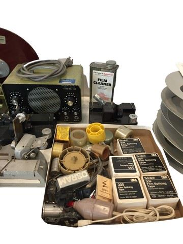 Picture and sound cutters, amp, (5) 35 mm reels, (1) 16mm reel, reel locks, (4) gang sync block, plus a ton of tape and other parts. This item comes from the collection of Alan Hauge, a director and producer known for "Force of Darkness" (1985), "Five Billion" "Six" (1976).