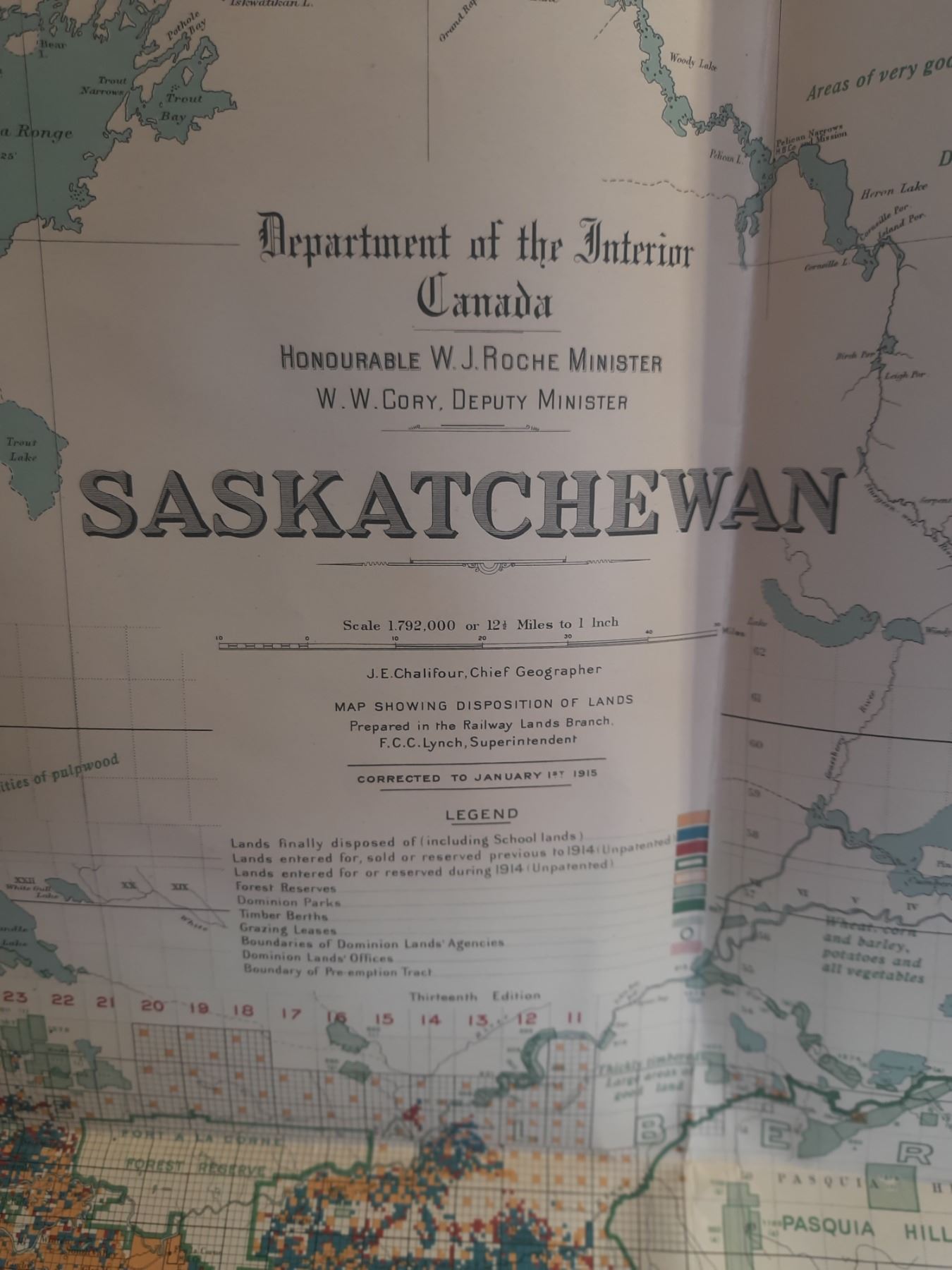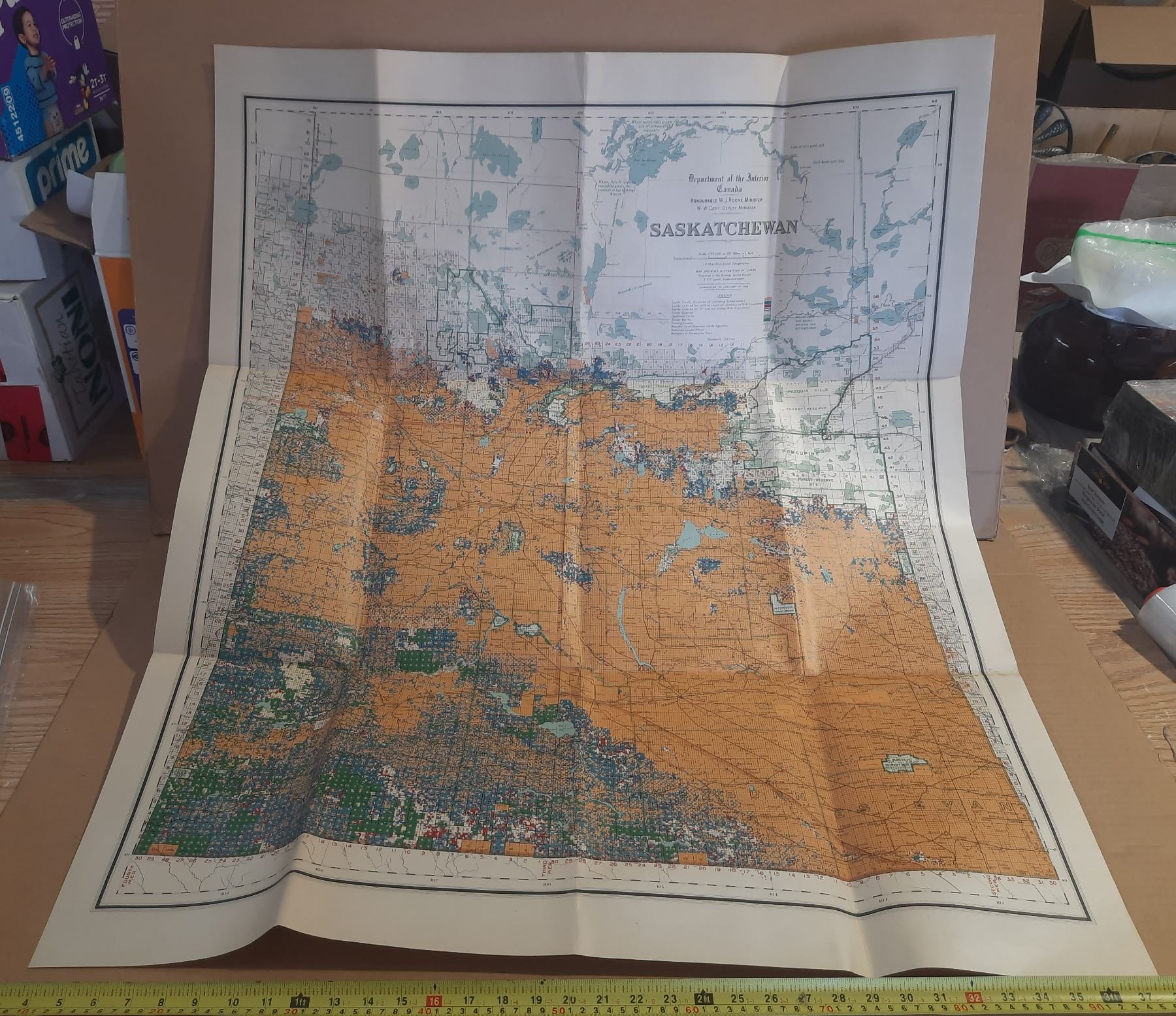 35" x 42" Saskatchewan Map 1915 Very Good Condition.