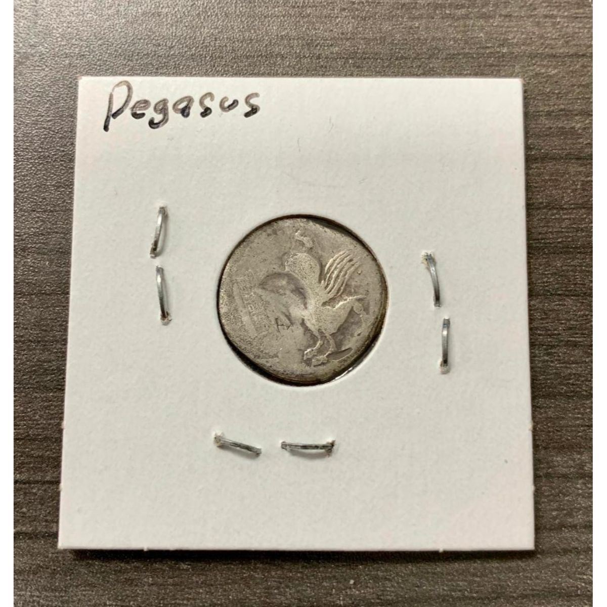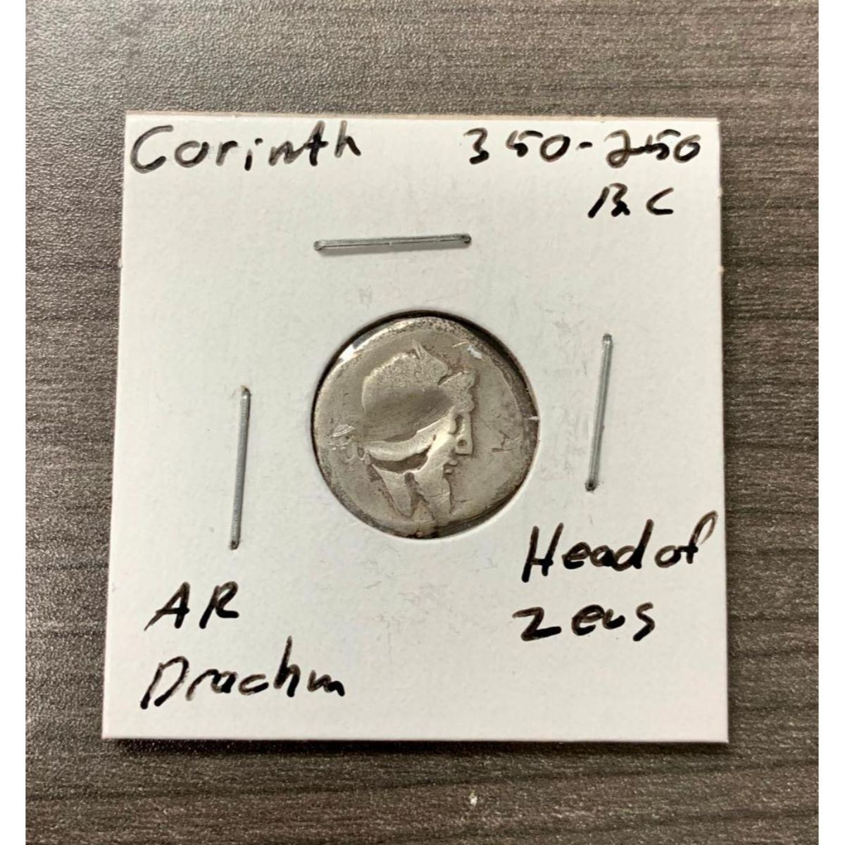 A 350-250 B.C. Corinth Head of Zeus Silver Drachm. Has a peculiar punch mark on the obverse side of the coin, possibly a special mark left by the smith. Please view photos for further details.Â