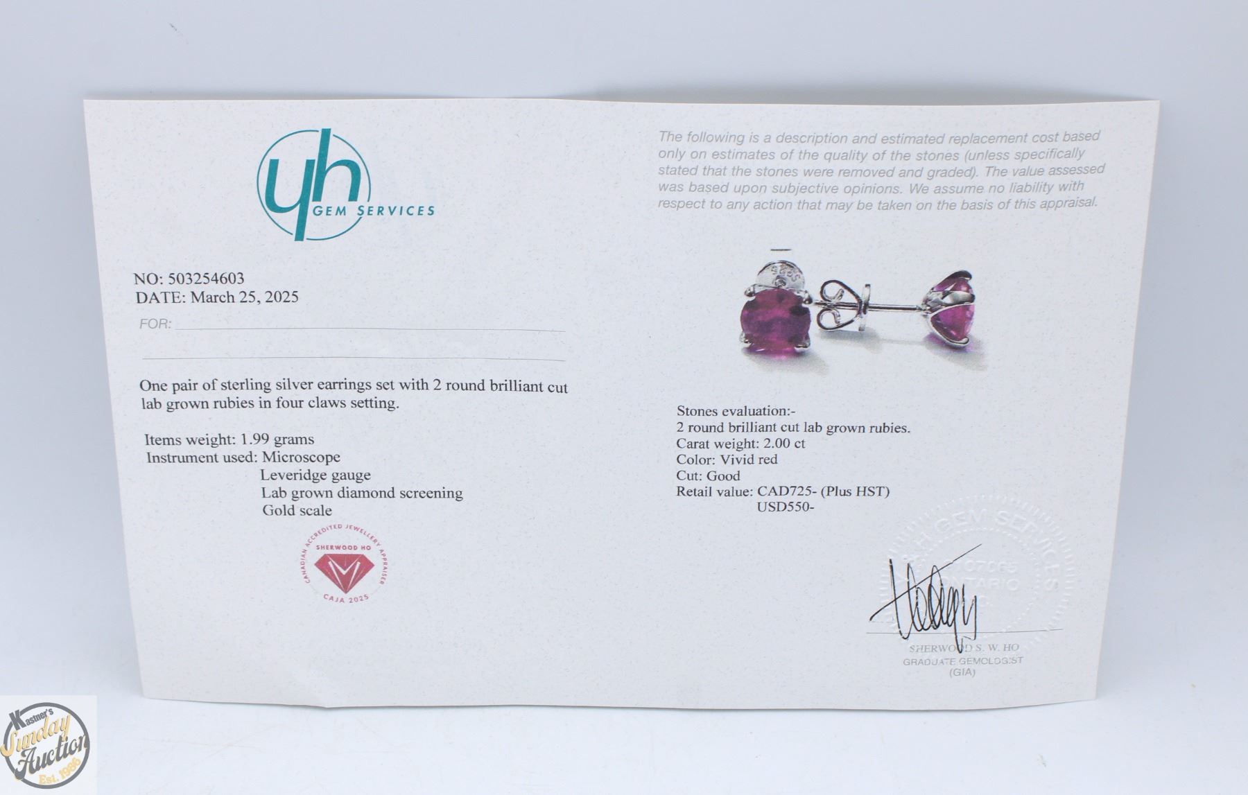 LAB GROWN RUBIES VIVID RED COLOR SET IN 4 CLAW V HEAD SET IN 925 SILVER EARRINGS RETAIL VALUE $725.00 **ALL ITEMS MUST BE REMOVED BY 5PM SATURDAY, NOVEMBER 8th 2025. ALL REMAINING ITEMS WILL BE SUBJECT TO A $6.00 PER DAY STORAGE CHARGE. ANY ITEMS REMAINING AFTER MONDAY, NOVEMBER 24TH 2025 WILL BE CONSIDERED FORFEITED. NO REFUNDS WILL BE ISSUED FOR FORFEITED ITEMS. TO SCHEDULE A PICK UP APPOINTMENT CLICK HERE
