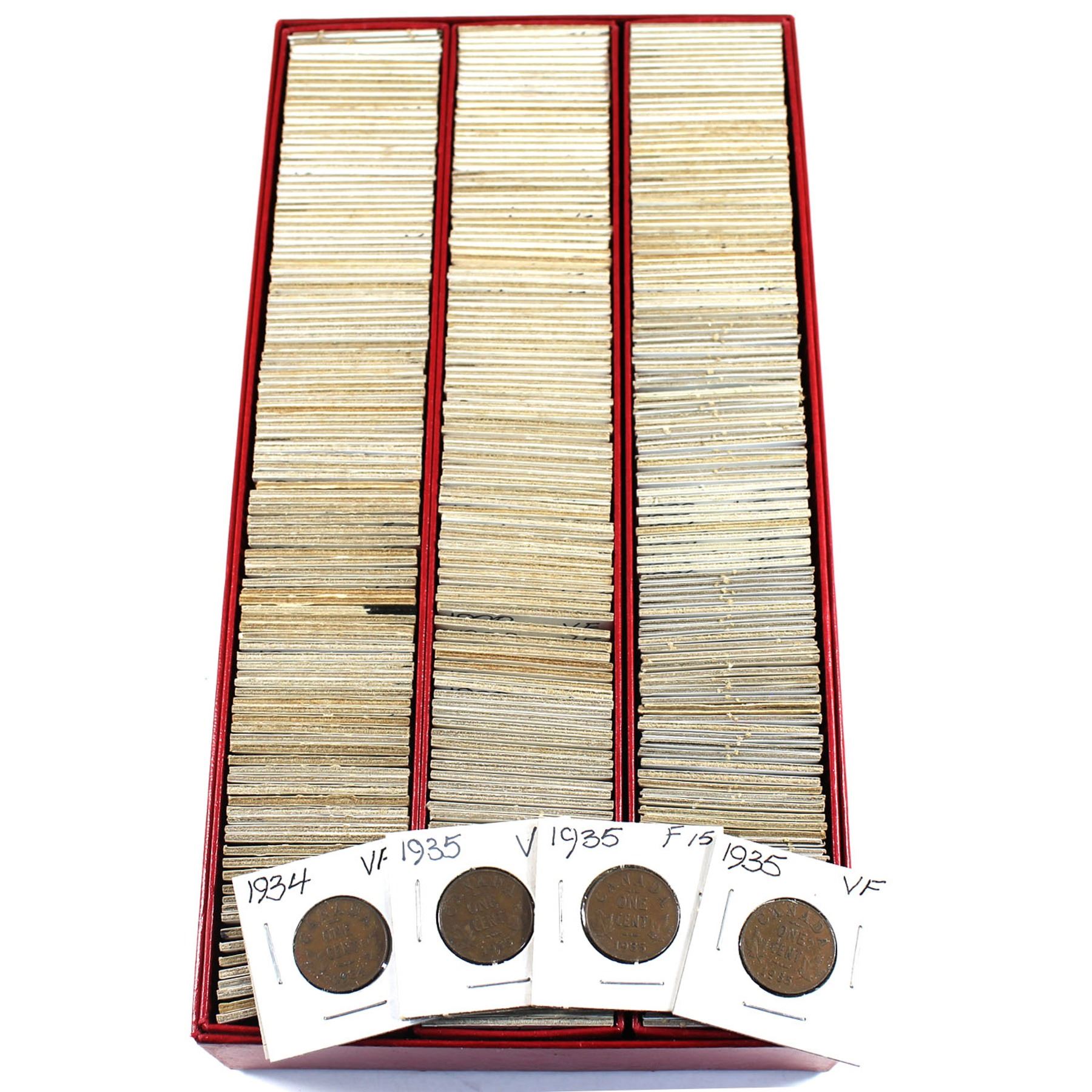 A Great Dealer Lot of 350x George 5th Small 1-cent 1920-1936. VG-EF condition. Very few culls, most coins are Fine or better, great assortment of dates. Worth a premium bid!