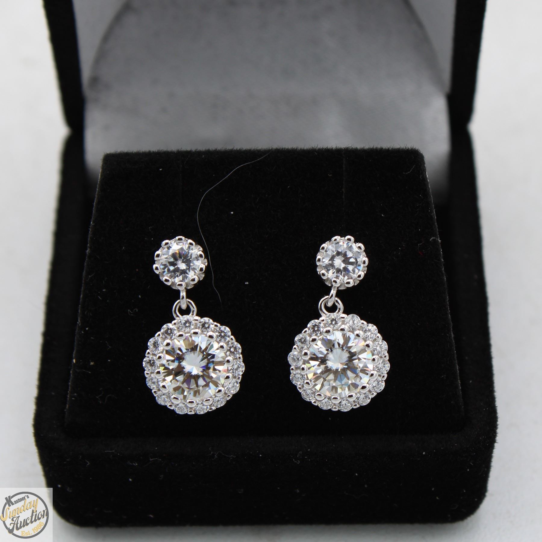 MOISSANITE STONES VVS D COLOR WITH 30 ROUND BRILLIANT CUT CUBIC ZIRCONIA SET IN ROUND HALO WITH ONE SET ABOVE WITH HALO DANGLING AND SET IN 925 SILVER EARRINGS RETAIL VALUE $925.00 **ALL ITEMS MUST BE REMOVED BY 5PM SATURDAY, NOVEMBER 8th 2025. ALL REMAINING ITEMS WILL BE SUBJECT TO A $6.00 PER DAY STORAGE CHARGE. ANY ITEMS REMAINING AFTER MONDAY, NOVEMBER 24TH 2025 WILL BE CONSIDERED FORFEITED. NO REFUNDS WILL BE ISSUED FOR FORFEITED ITEMS. TO SCHEDULE A PICK UP APPOINTMENT CLICK HERE