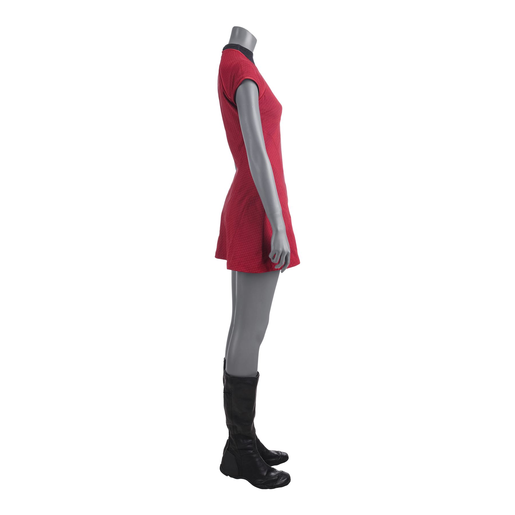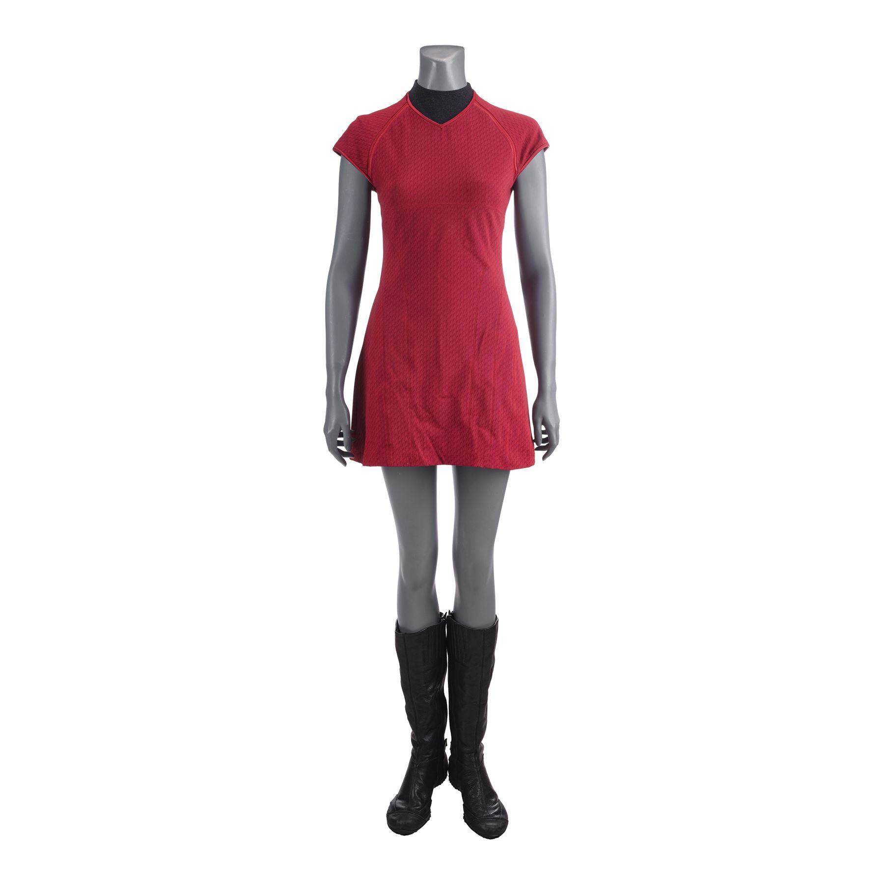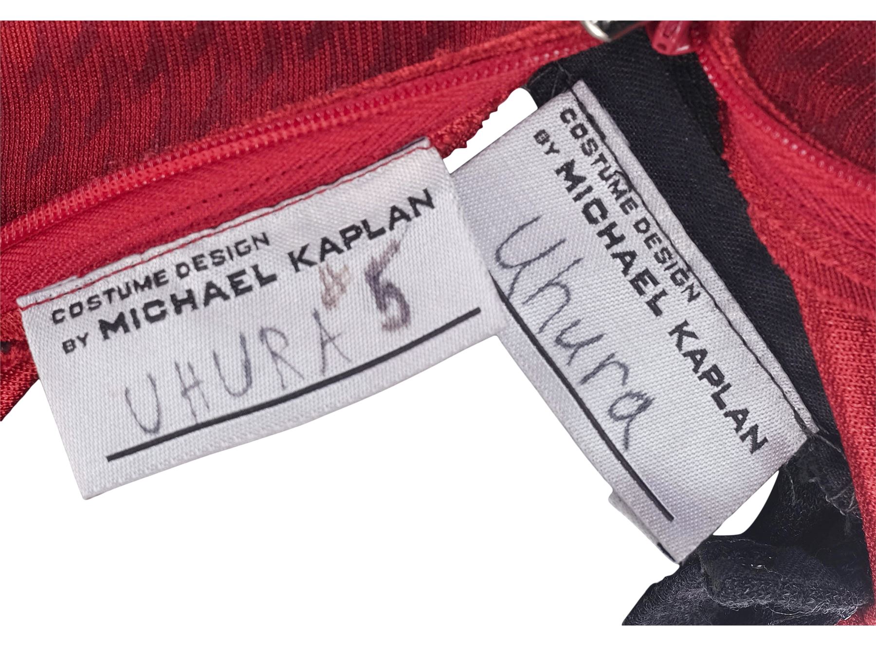 This costume consists of a lycra-blend red cap-sleeve dress with a resin Starfleet combadge attached and a dark gray bodysuit with a built-in dickey and shorts, both of which feature Michael Kaplan costume labels on their interiors hand-marked "Uhura." Also included to complete the costume is a pair of black DKNY leather boots (size 8) hand-labeled "Dee Fife Enterprise" in blue ink from the production of Star Trek: Enterprise. This dress and bodysuit exhibit creasing from wear, and the boots exhibit scuffing.