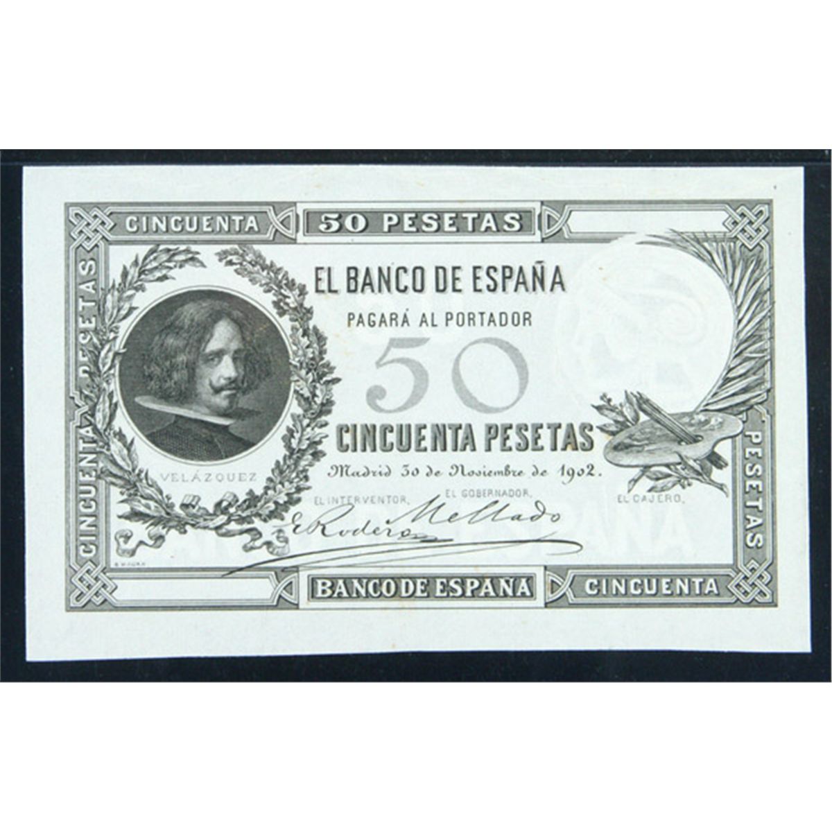 Spain. Face Proof for the 1902 50 Pesetas, P-52. Dated Madrid 30 November 1902. Black on white impression with portrait of Velazquez at left. Graded by Paper Money Guaranty, PMG-Choice Uncirculated 64. Filabo-93p (800 Euros). Very Rare.