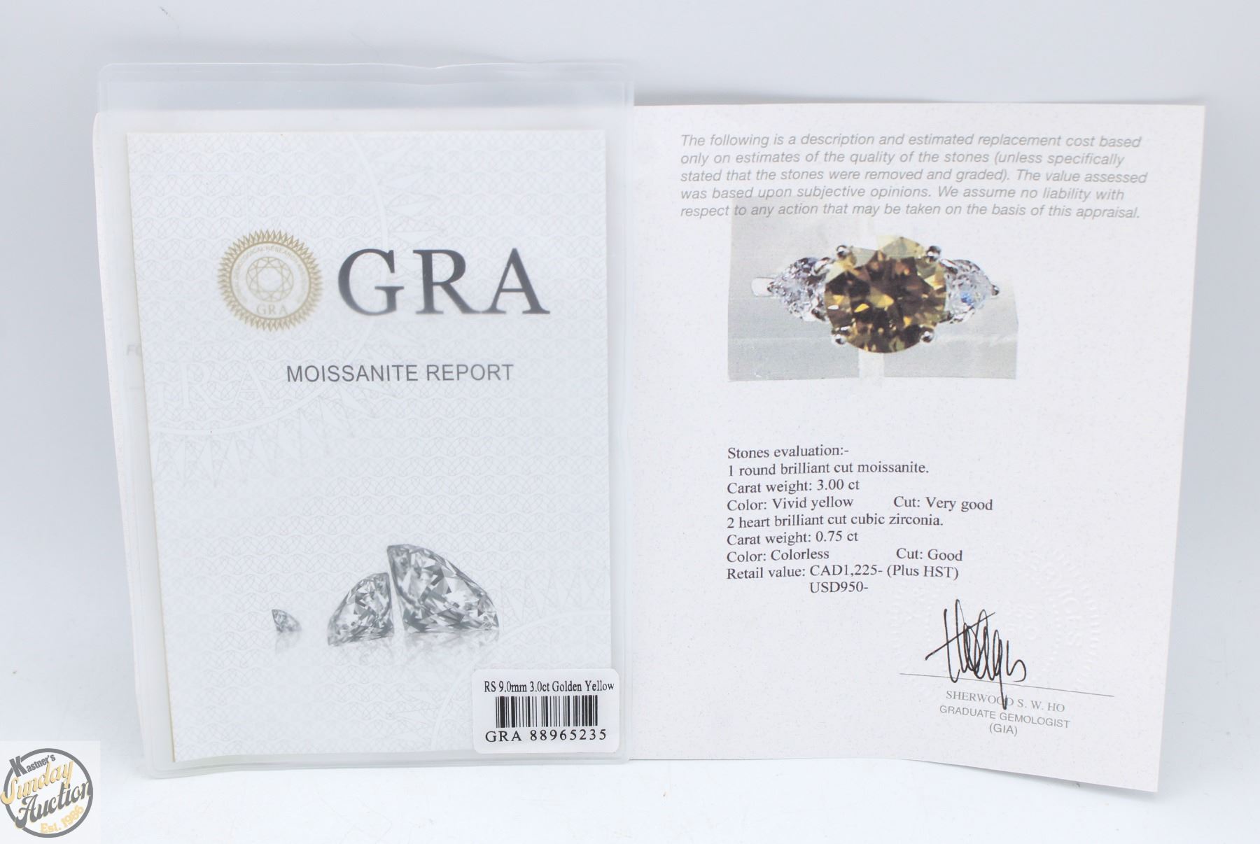 CUT MOISSANITE STONE VVS VIVID YELLOW COLOR SET IN CENTER WITH HEART SHAPED BRILLIANT CUT CUBIC ZIRCONIA SET ON EITHER SIDE SET IN 925 SILVER RING SIZE 7 RETAIL VALUE $1,225.00 **ALL ITEMS MUST BE REMOVED BY 5PM SATURDAY, NOVEMBER 22ND 2025. ALL REMAINING ITEMS WILL BE SUBJECT TO A $6.00 PER DAY STORAGE CHARGE. ANY ITEMS REMAINING AFTER MONDAY, DECEMBER 8TH 2025 WILL BE CONSIDERED FORFEITED. NO REFUNDS WILL BE ISSUED FOR FORFEITED ITEMS. TO SCHEDULE A PICK UP APPOINTMENT CLICK HERE