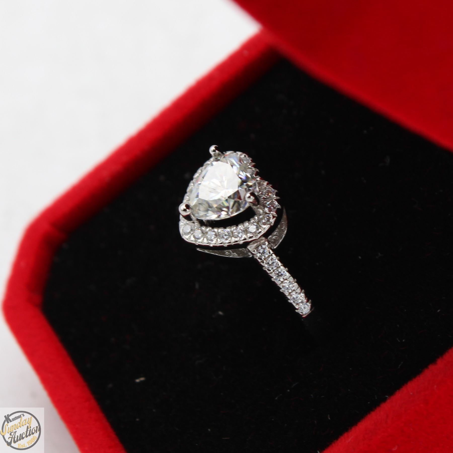 CUT MOISSANITE STONE VVS D COLOR WITH 32 ROUND BRILLIANT CUT CUBIC ZIRCONIA SET IN HEART HALO WITH MORE SET IN SHANKS SET IN 925 SILVER RING SIZE ADJUSTABLE **ALL ITEMS MUST BE REMOVED BY 5PM SATURDAY, NOVEMBER 22ND 2025. ALL REMAINING ITEMS WILL BE SUBJECT TO A $6.00 PER DAY STORAGE CHARGE. ANY ITEMS REMAINING AFTER MONDAY, DECEMBER 8TH 2025 WILL BE CONSIDERED FORFEITED. NO REFUNDS WILL BE ISSUED FOR FORFEITED ITEMS. TO SCHEDULE A PICK UP APPOINTMENT CLICK HERE