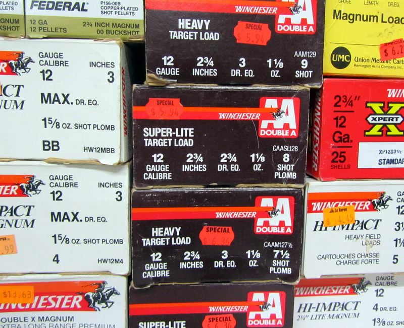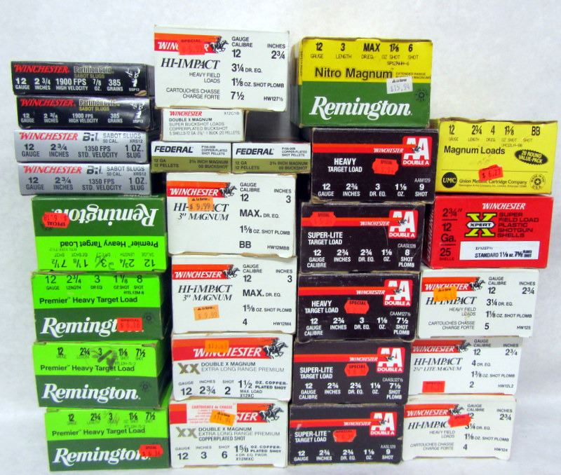 ASSORTED SHOT SIZES. INCLUDES SLUGS, BUCKSHOT, AND RELOADS.