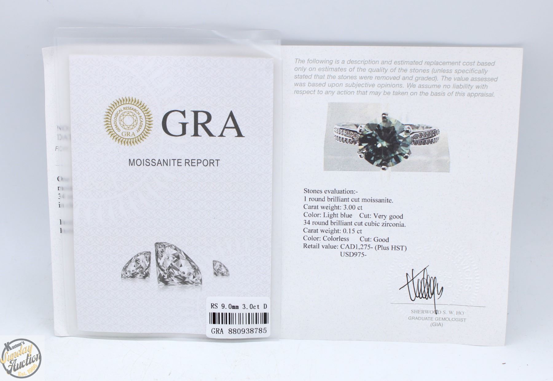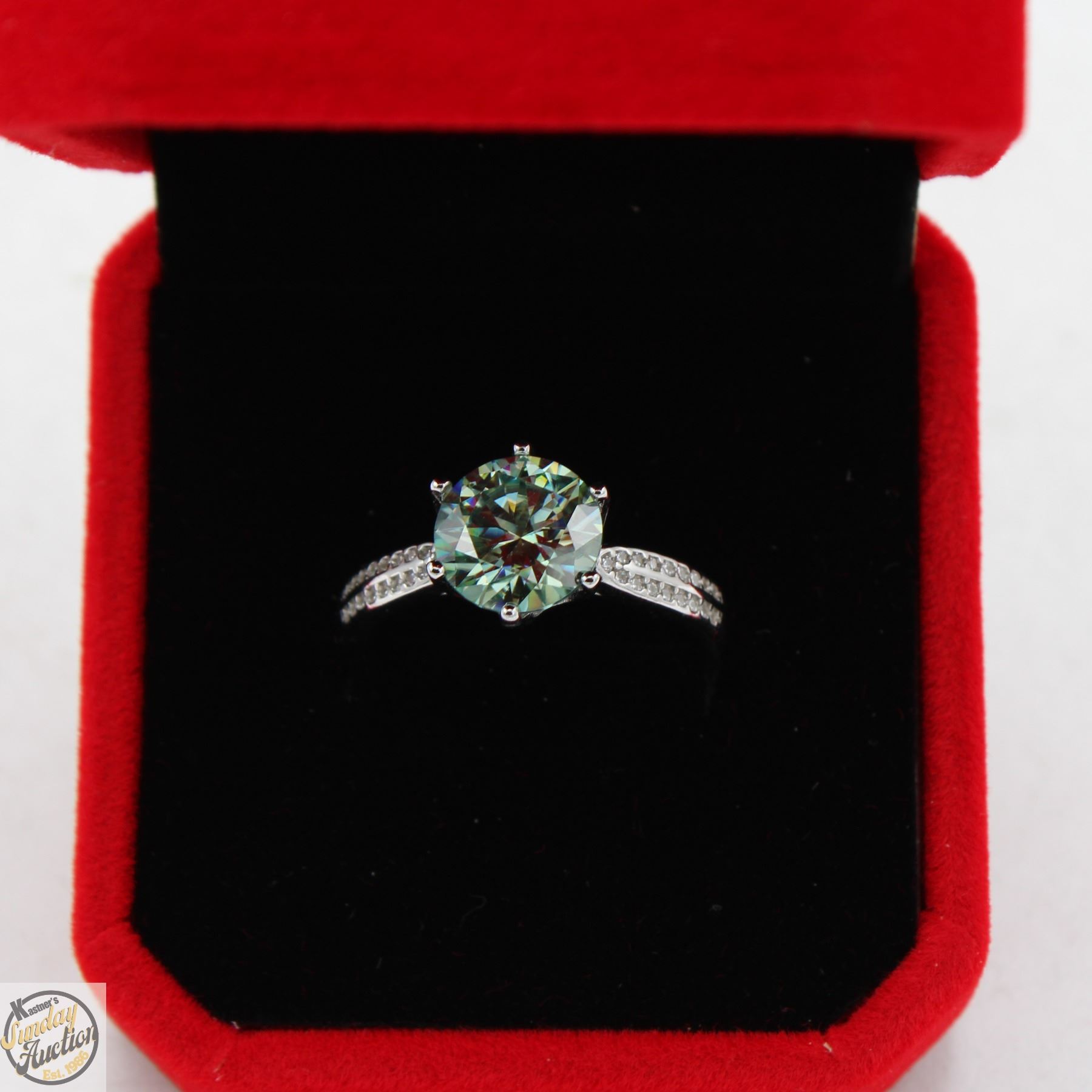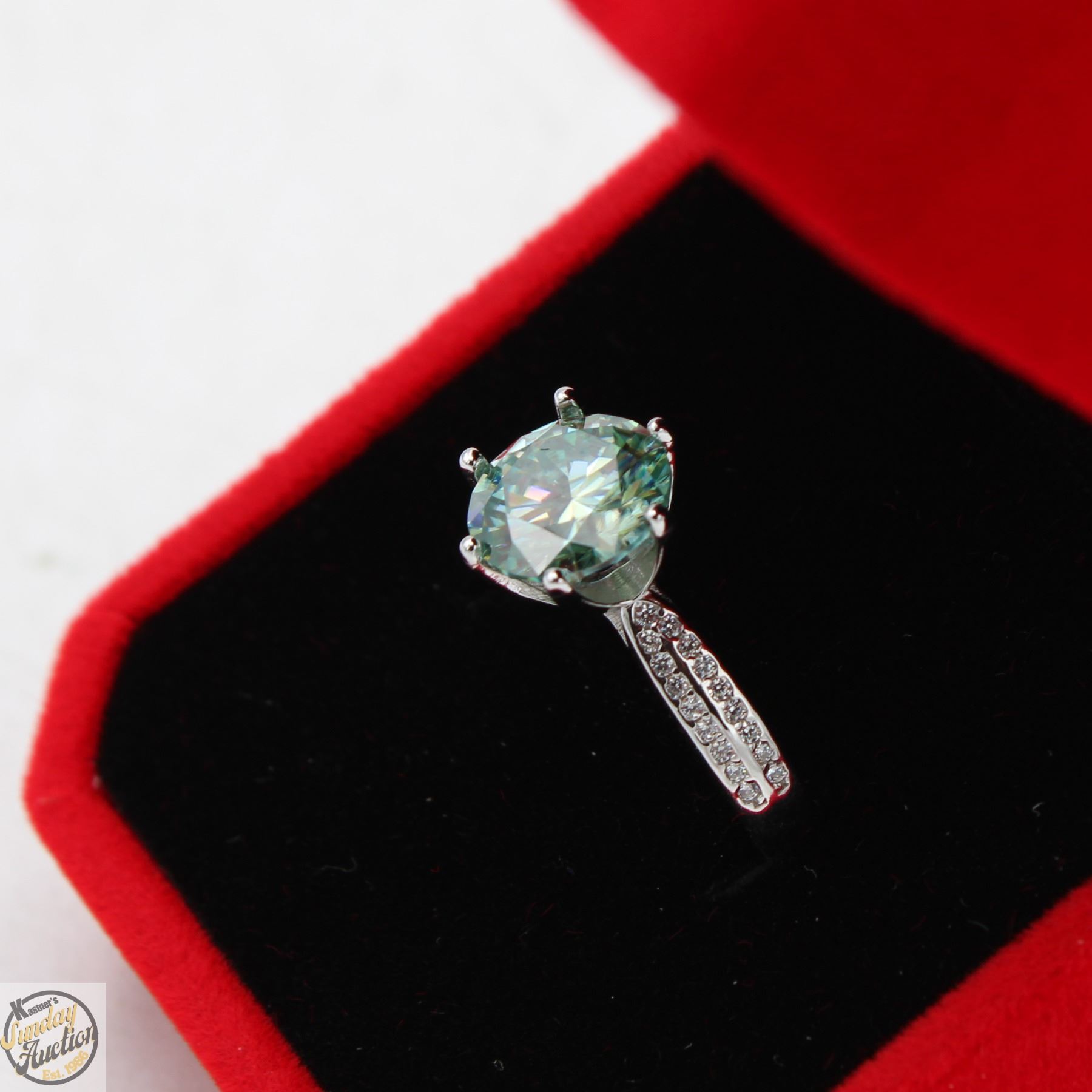 CUT MOISSANITE STONE VVS LIGHT BLUE COLOR WITH 34 ROUND BRILLIANT CUT CUBIC ZIRCONIA SET IN SHANKS SET IN 925 SILVER RING SIZE 9 RETAIL VALUE $1,275.00 **ALL ITEMS MUST BE REMOVED BY 5PM SATURDAY, NOVEMBER 22ND 2025. ALL REMAINING ITEMS WILL BE SUBJECT TO A $6.00 PER DAY STORAGE CHARGE. ANY ITEMS REMAINING AFTER MONDAY, DECEMBER 8TH 2025 WILL BE CONSIDERED FORFEITED. NO REFUNDS WILL BE ISSUED FOR FORFEITED ITEMS. TO SCHEDULE A PICK UP APPOINTMENT CLICK HERE