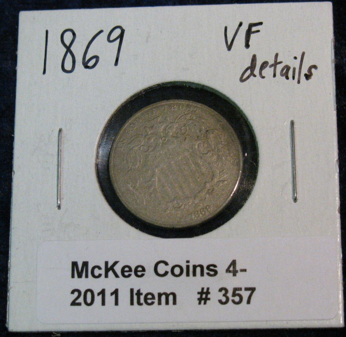 357. 1869 U.S. Shield Nickel. Cleaned. VF Details.
