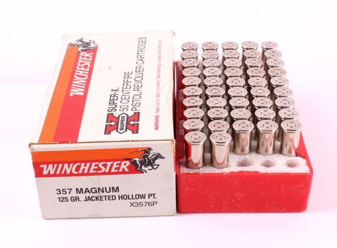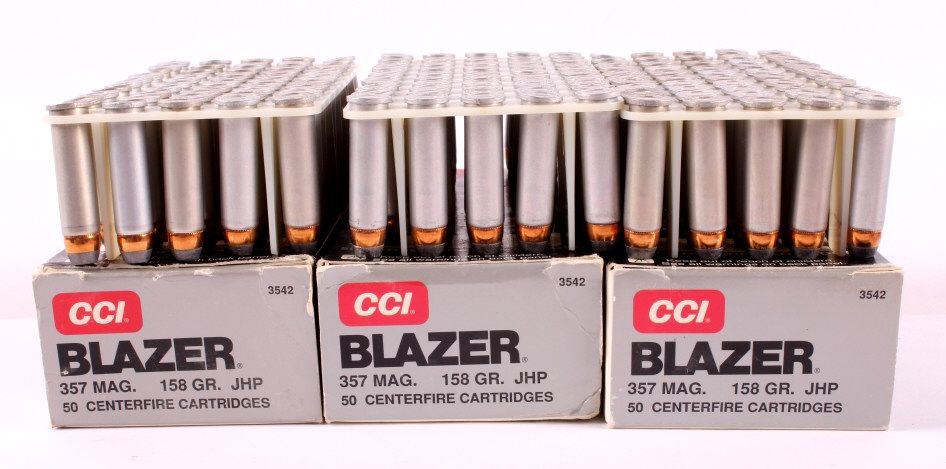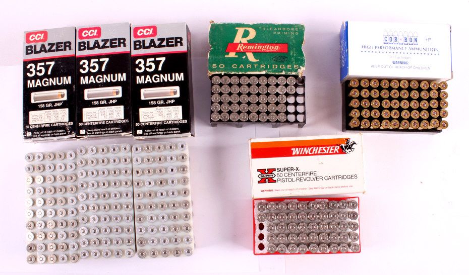 This lot includes 6 boxes of .357 ammunition. The 3 Blazer boxes are full with (50) 158gr. jacketed hollow point. The Cor-Bon box is full with (50) 115gr. jacketed hollow point. The Winchester box has (47) 125gr. jacketed hollow point. The Remington Kleanbore box has (42) rounds. All the ammunition is in new, unfired condition.
