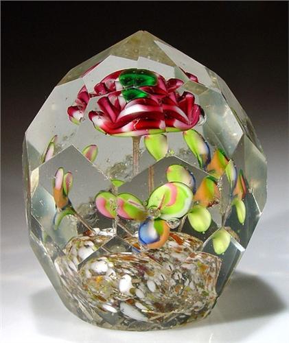 Antique Bohemian faceted high-domed rose and flowers paperweight, containing a multi-tiered, green-centered, pink and white rose, encircled by a spaced ring of three small multi-colored flowers, all growing from a white, brown, gold, and silver-speckled cushion. All-over geometric facets. Height 3 3/4". Surface damage to facets. NO RESERVE