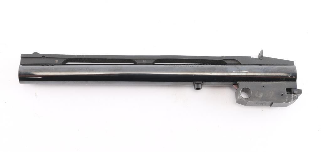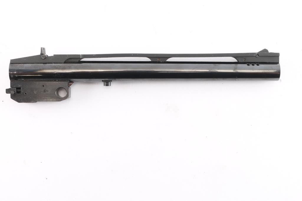 Thompson Contender barrel chambered in .357 Magnum. This is a 10 " blued serrated vent ribbed barrel with a blade front sight, a folding square notch rear sight, and six barrel ports. The bore is bright with strong rifling. The blued finish is very good with approximately 94% remaining showing scattered handling losses, scratches on the vent rib, and some losses where the action rubs.