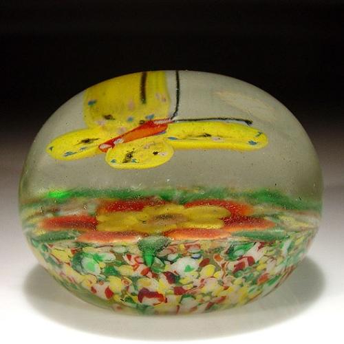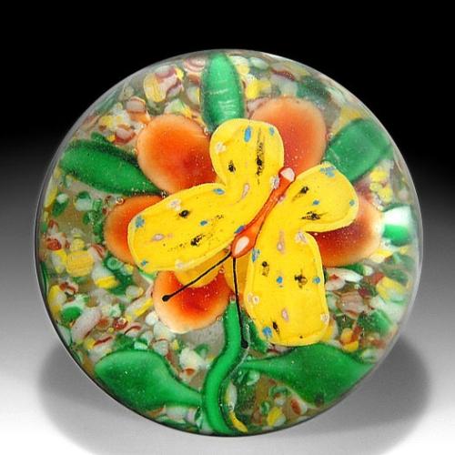 Chinese butterfly and flower paperweight, with a yellow butterfly, hovering above an orange and yellow double-tiered flower, resting on speckled multi-colored ground. Diameter 3 1/8". NO RESERVE
