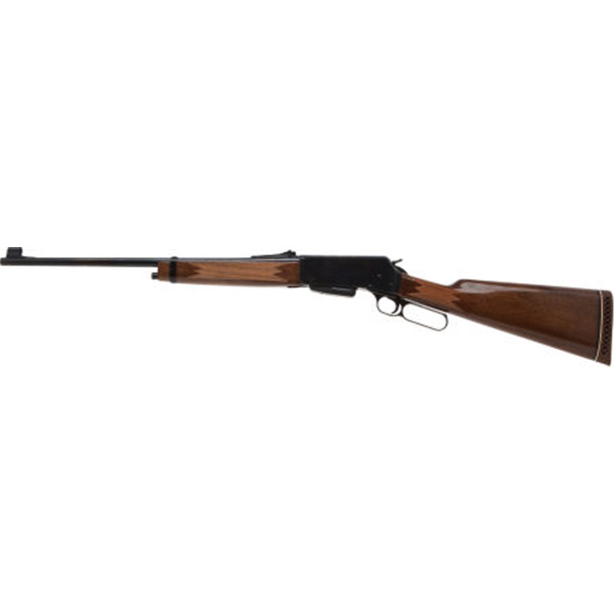 .358 Win. Browning BLR Lever Action Rifle. Serial no. 30733RT127. .358 Winchester. 20-inch barrel. Blued lever action. Detachable magazine. Checkered straight grip stock and fore-end. Maker's recoil pad. Maker's full length naugahyde trunk case. Condition: Excellent, showing little use. Case in excellent condition. NRA FIREARMS FOR FREEDOM PROGRAM