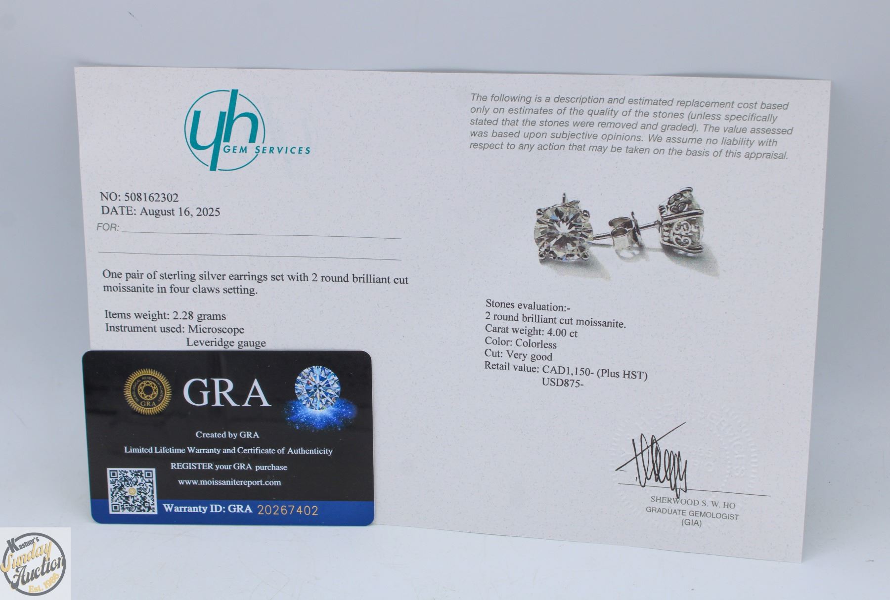 BRILLIANT CUT MOISSANITE STONE VVS D COLOR SET IN 4 CLAW FILAGREE HEAD SET IN 925 SILVER EARRINGS RETAIL VALUE $1,150.00 **ALL ITEMS MUST BE REMOVED BY 5PM SATURDAY, NOVEMBER 22ND 2025. ALL REMAINING ITEMS WILL BE SUBJECT TO A $6.00 PER DAY STORAGE CHARGE. ANY ITEMS REMAINING AFTER MONDAY, DECEMBER 8TH 2025 WILL BE CONSIDERED FORFEITED. NO REFUNDS WILL BE ISSUED FOR FORFEITED ITEMS. TO SCHEDULE A PICK UP APPOINTMENT CLICK HERE