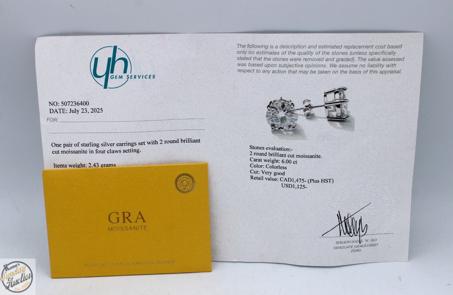 BRILLIANT CUT MOISSANITE STONES VVS D COLOR SET IN 4 CLAW BASKET HEAD SET IN 925 SILVER EARRINGS RETAIL VALUE $1,475.00 **ALL ITEMS MUST BE REMOVED BY 5PM SATURDAY, NOVEMBER 22ND 2025. ALL REMAINING ITEMS WILL BE SUBJECT TO A $6.00 PER DAY STORAGE CHARGE. ANY ITEMS REMAINING AFTER MONDAY, DECEMBER 8TH 2025 WILL BE CONSIDERED FORFEITED. NO REFUNDS WILL BE ISSUED FOR FORFEITED ITEMS. TO SCHEDULE A PICK UP APPOINTMENT CLICK HERE